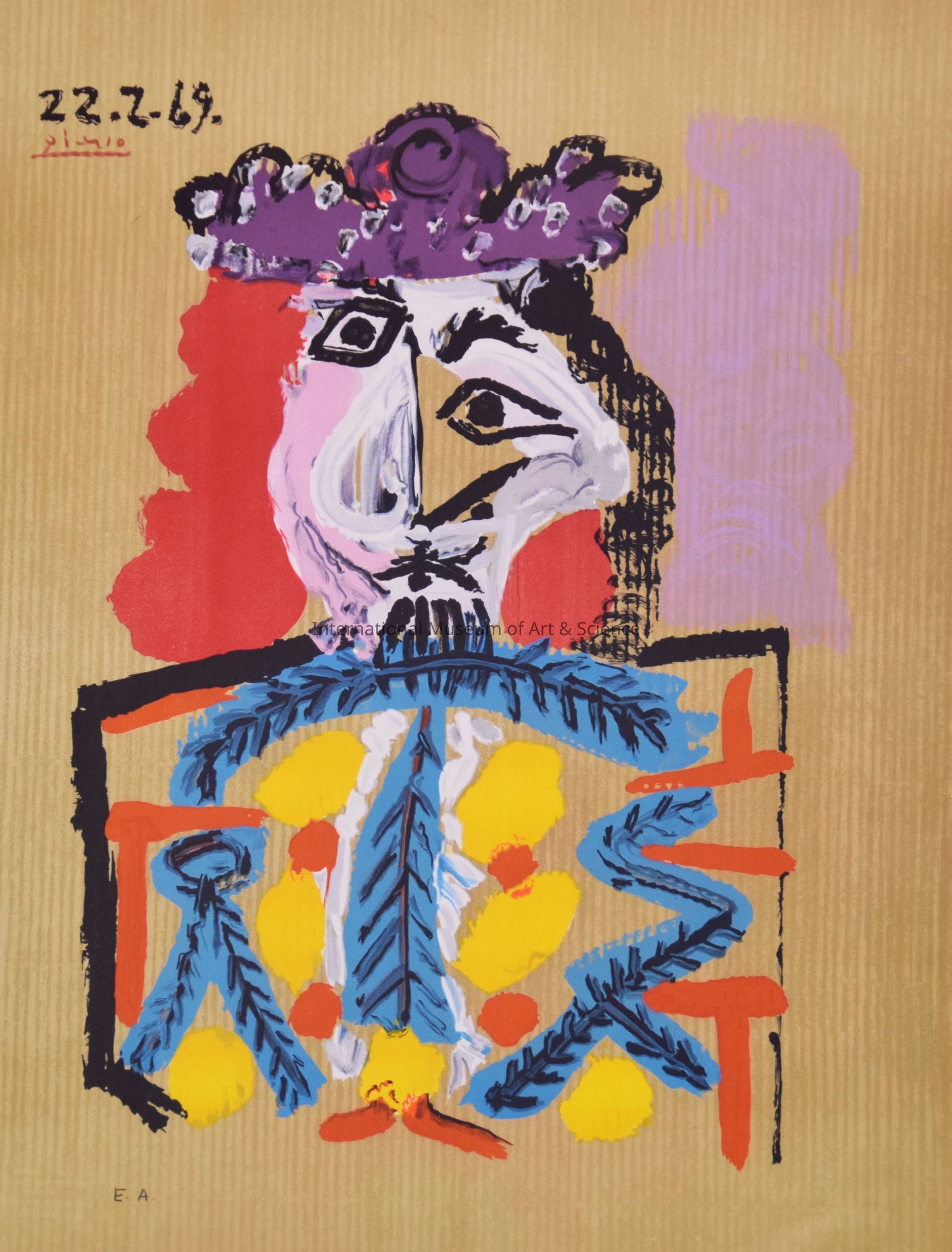 A lithograph print from the series of Imaginary Portraits, Pablo Picasso, printed by Marcel Salinas. This print is edition E.A. (epreuve d'artiste) or artist proof. The portrait has red hair, a purple hat, with a blue, yellow, black, white and orange body.Artwork Details