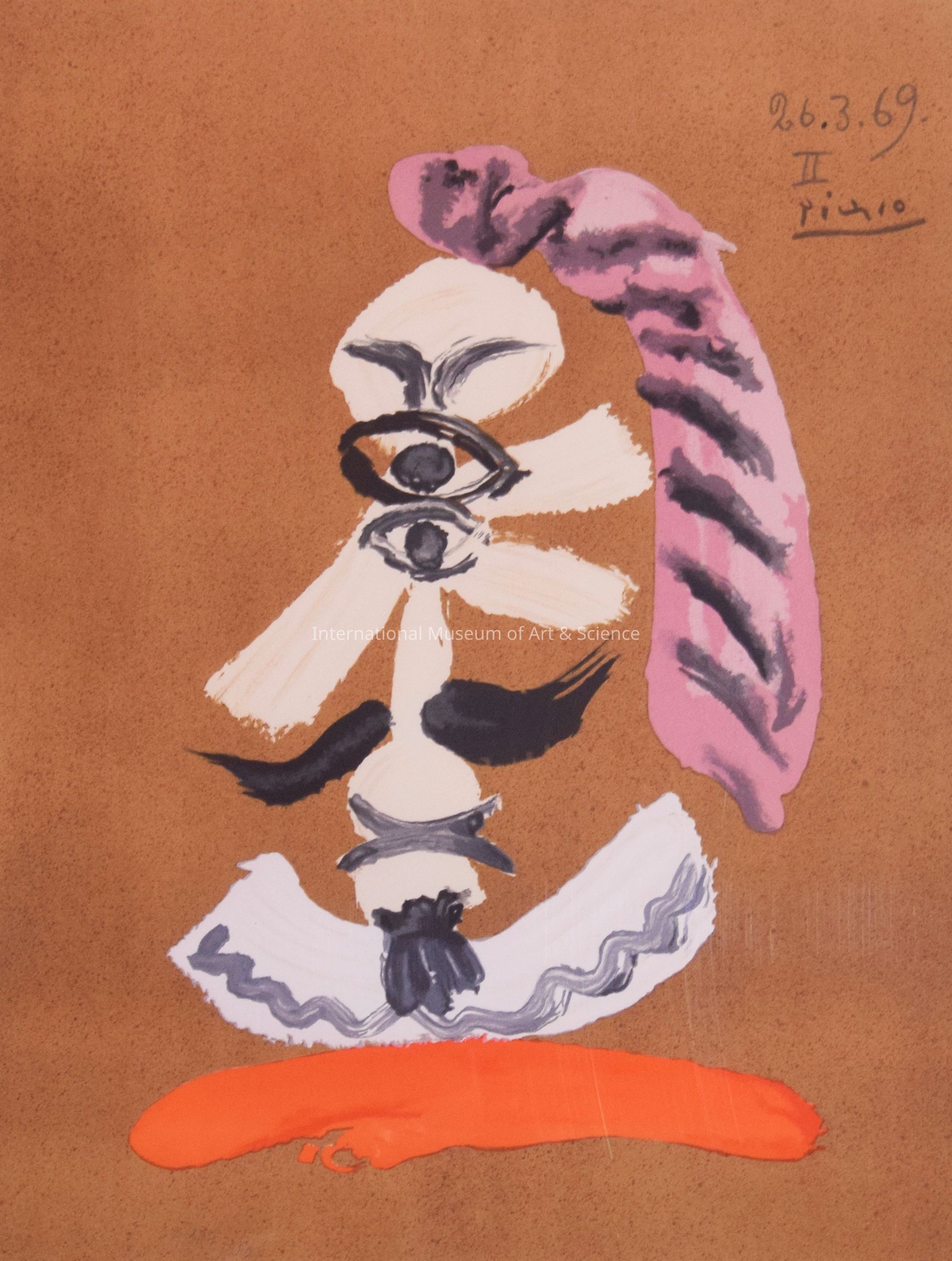 A lithograph print from the series of Imaginary Portraits, by Pablo Picasso, printed by Marcel Salinas. Distributed by Abrams Editions, New York. Signed Picasso in plate, upper right corner. Edition A177/250; embossed. Figure has pink hair with black lines, is wearing an Elizabethan collar and hass orange horizontal line below collar.Artwork Details