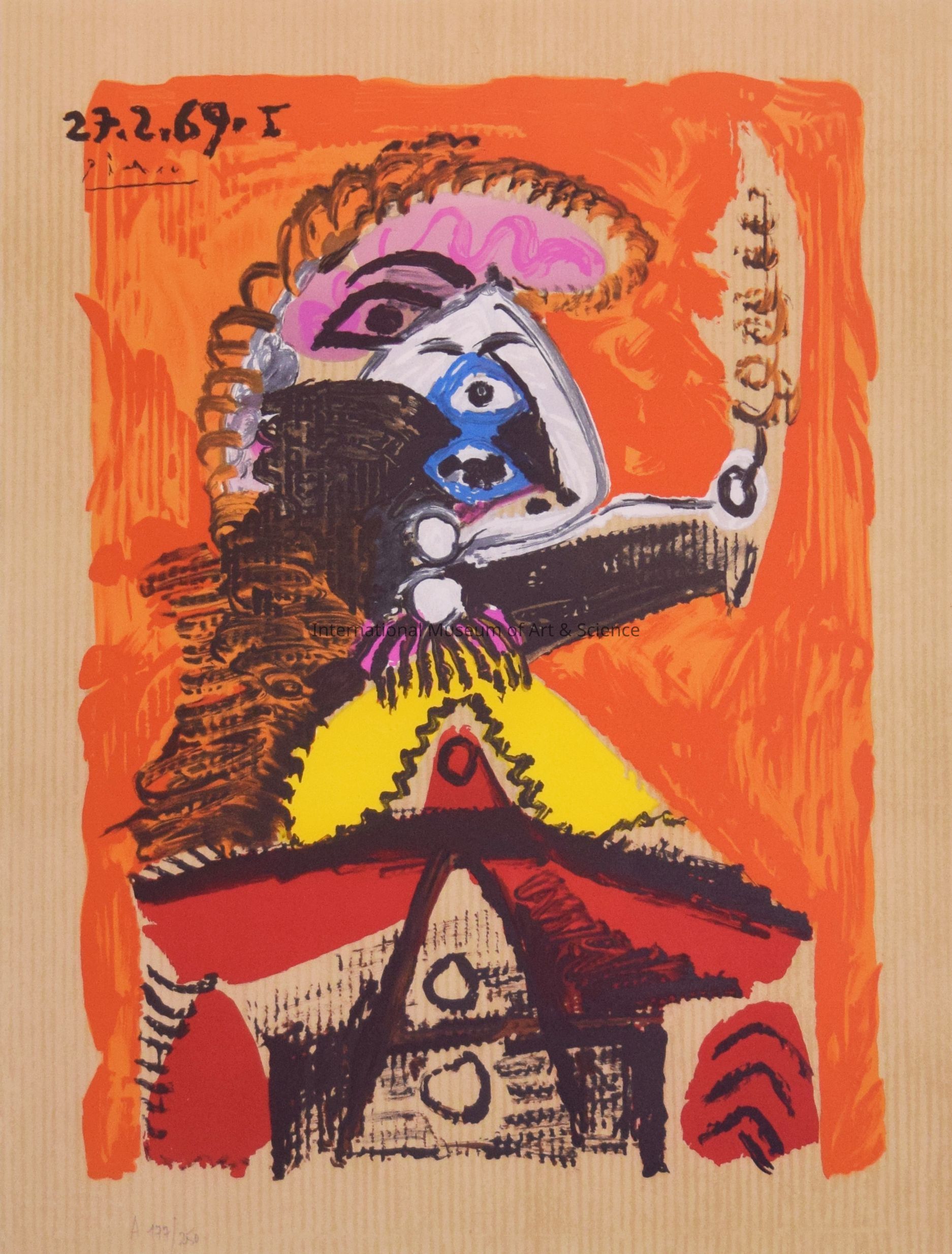 A lithograph print from the series of Imaginary Portraits, by Pablo Picasso, printed by Marcel Salinas. Distributed by Abrams Editions, New York. Signed Picasso in plate, upper left corner. Edition A177/250, embossed. Figure is in an orange painted background. The figure is smoking pipe, has purple hair, and blue around eye and mouth. The figure has red, yellow, brown, and black clothing.Artwork Details