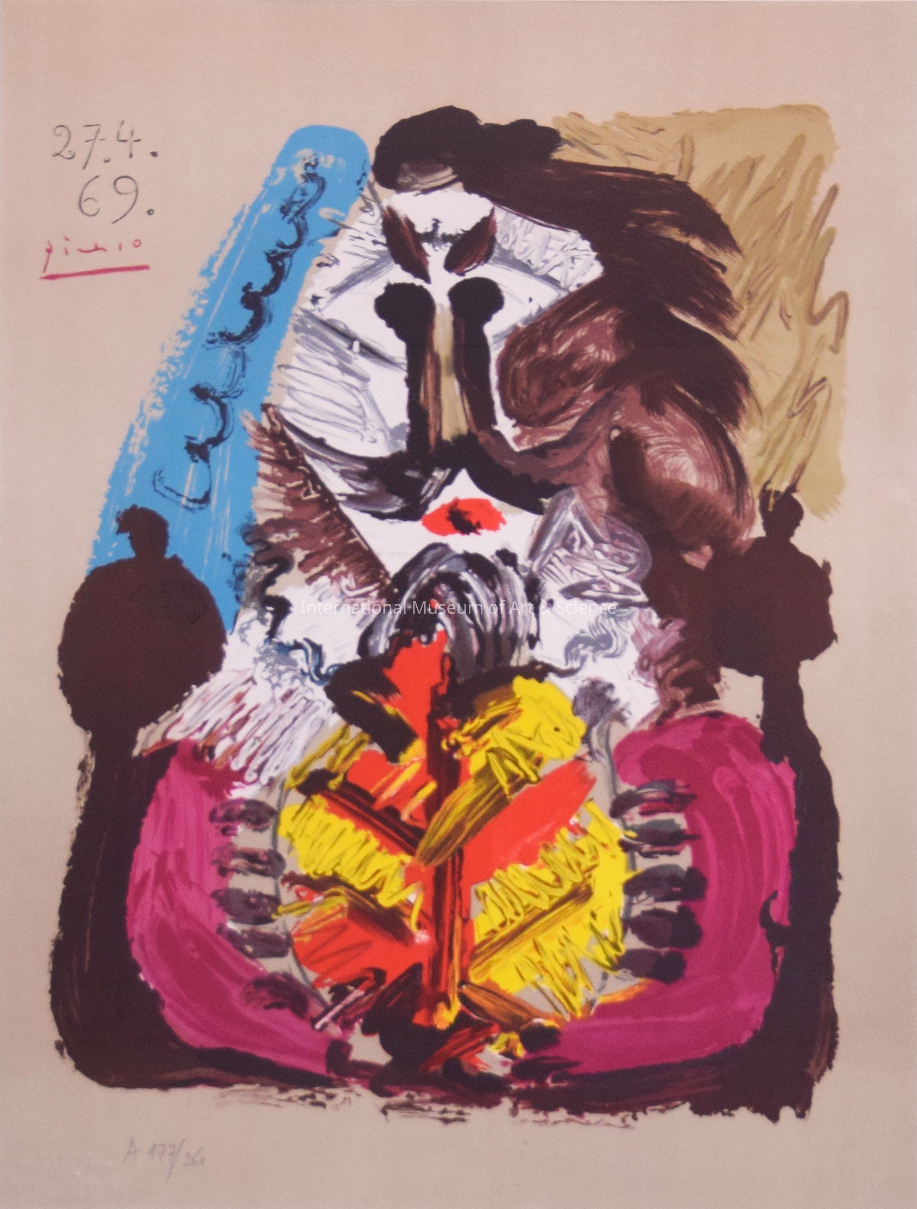 A lithograph print from the series of Imaginary Portraits, by Pablo Picasso, printed by Marcel Salinas. Distributed by Abrams Editions, New York. Signed Picasso in plate, upper left. Edition A177/250, embossed. Figure has light blue and brown hair. A grey, yellow, beige face with red, yellow, purple, and brown clothes.Artwork Details