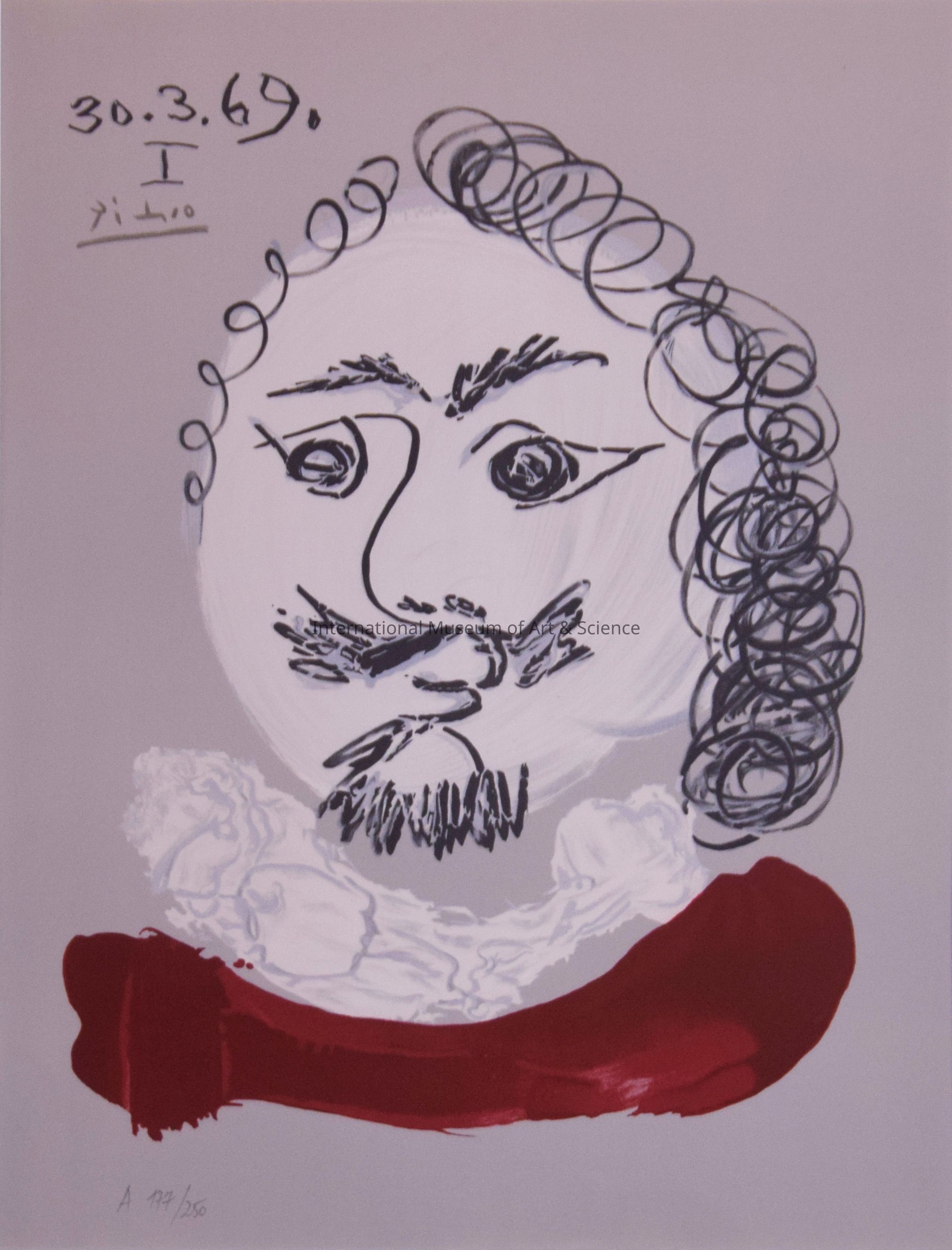 A lithograph print from the series of Imaginary Portraits, by Pablo Picasso, printed by Marcel Salinas. Distributed by Abrams Editions, New York. Signed Picasso in plate, upper left; not embossed. Edition A177/250. The figure has crimson clothes below white collar, white face, goatee, curly line-hair.Artwork Details