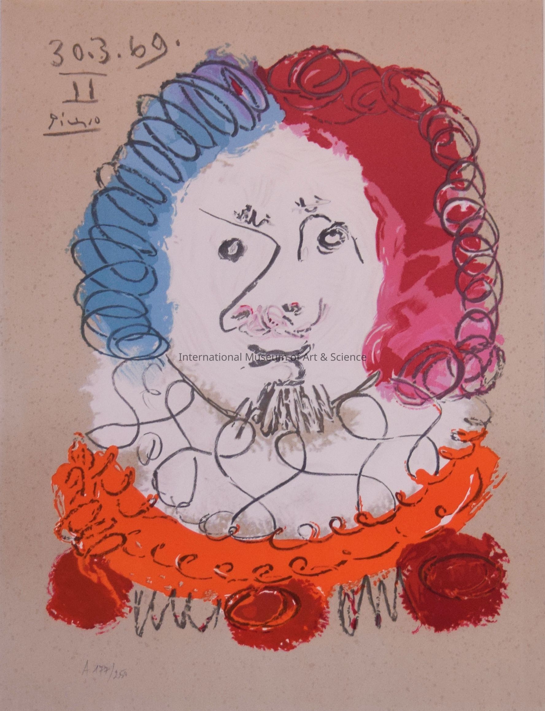 A lithograph print from the series of Imaginary Portraits, by Pablo Picasso, printed by Marcel Salinas. Distributed by Abrams Editions, New York. Signed Picasso in plate, upper left corner. Edition A177/250. The figure has crimson and pale blue curly hair, a white face with an orange collar below white collar. And there are 3 large red dots below orange collar.Artwork Details