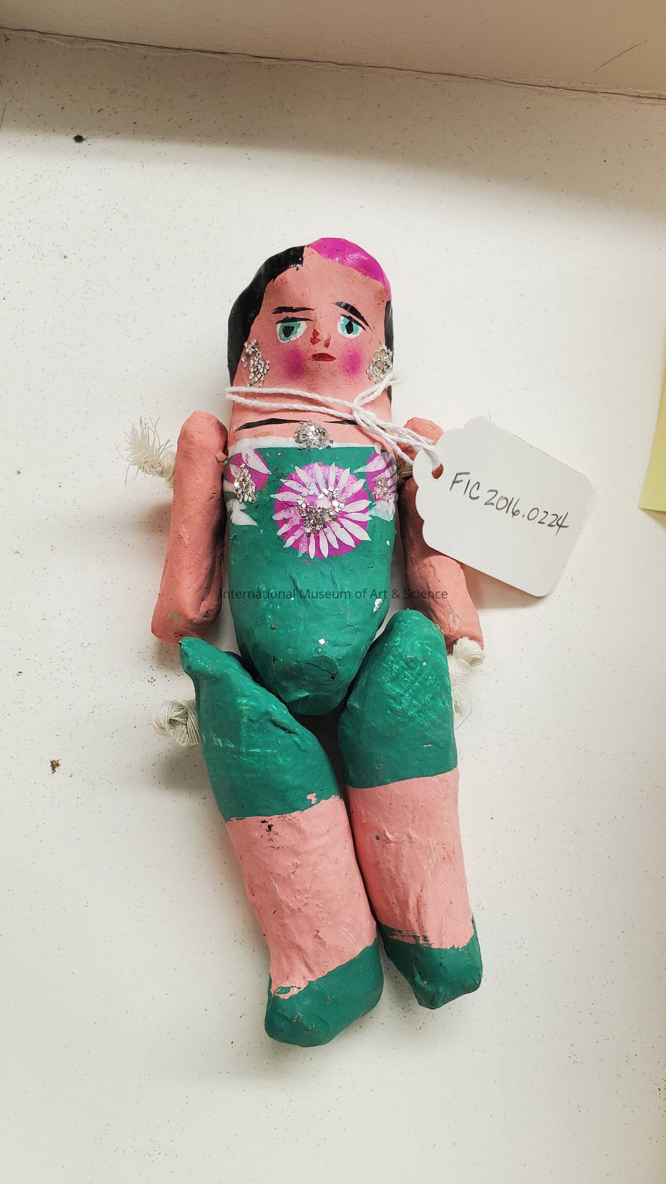 Papier-mâché figurine with green clothes and shoes, pale skin, blue eyes. The shirt has pink and white starburst/flower designs with silver glitter painted on itEthnography