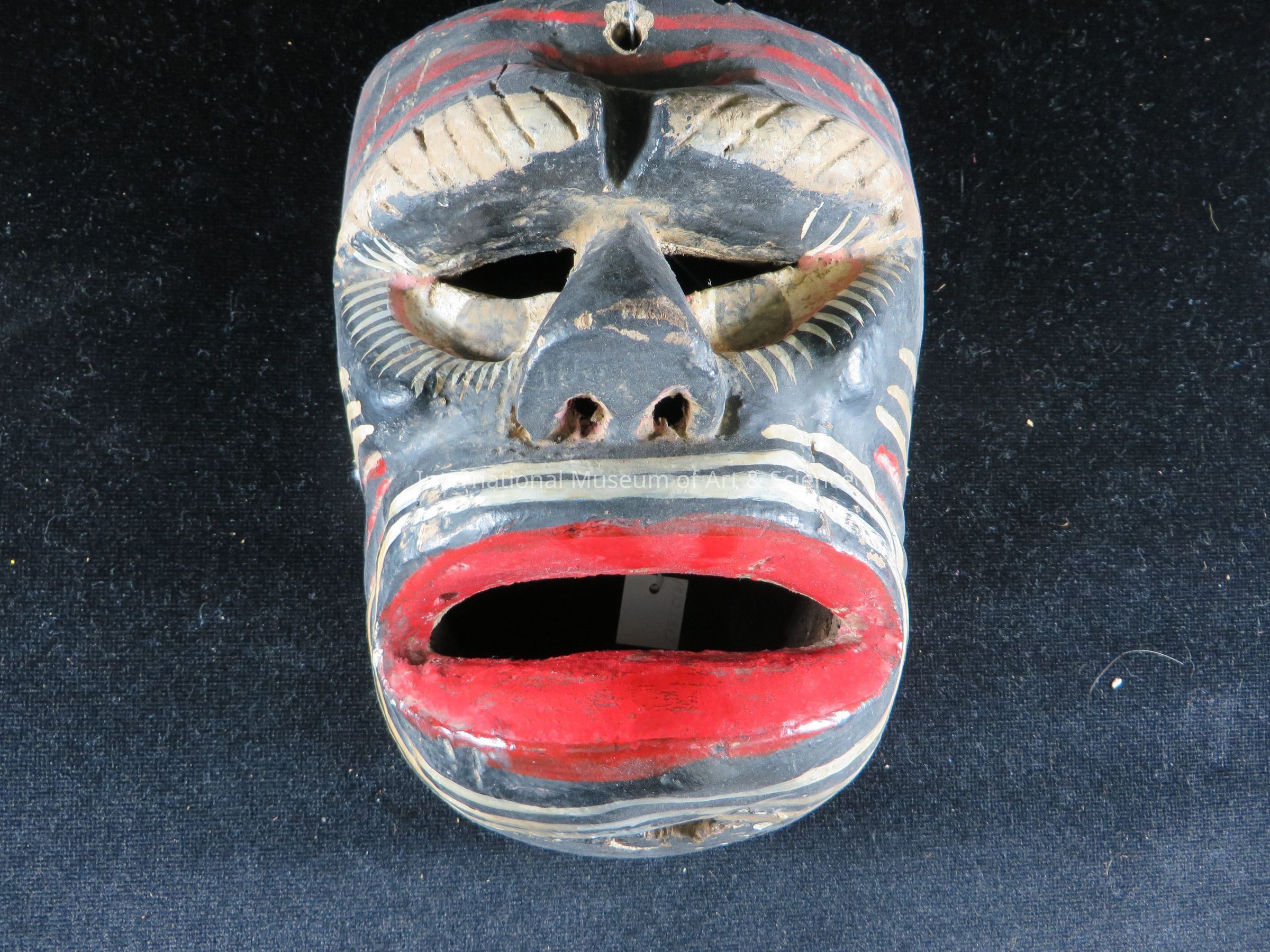 A wood carved mask. The mask shows a scowling face with white stripe details and large red lips. Possible a "Negrito"figure.Dimensions