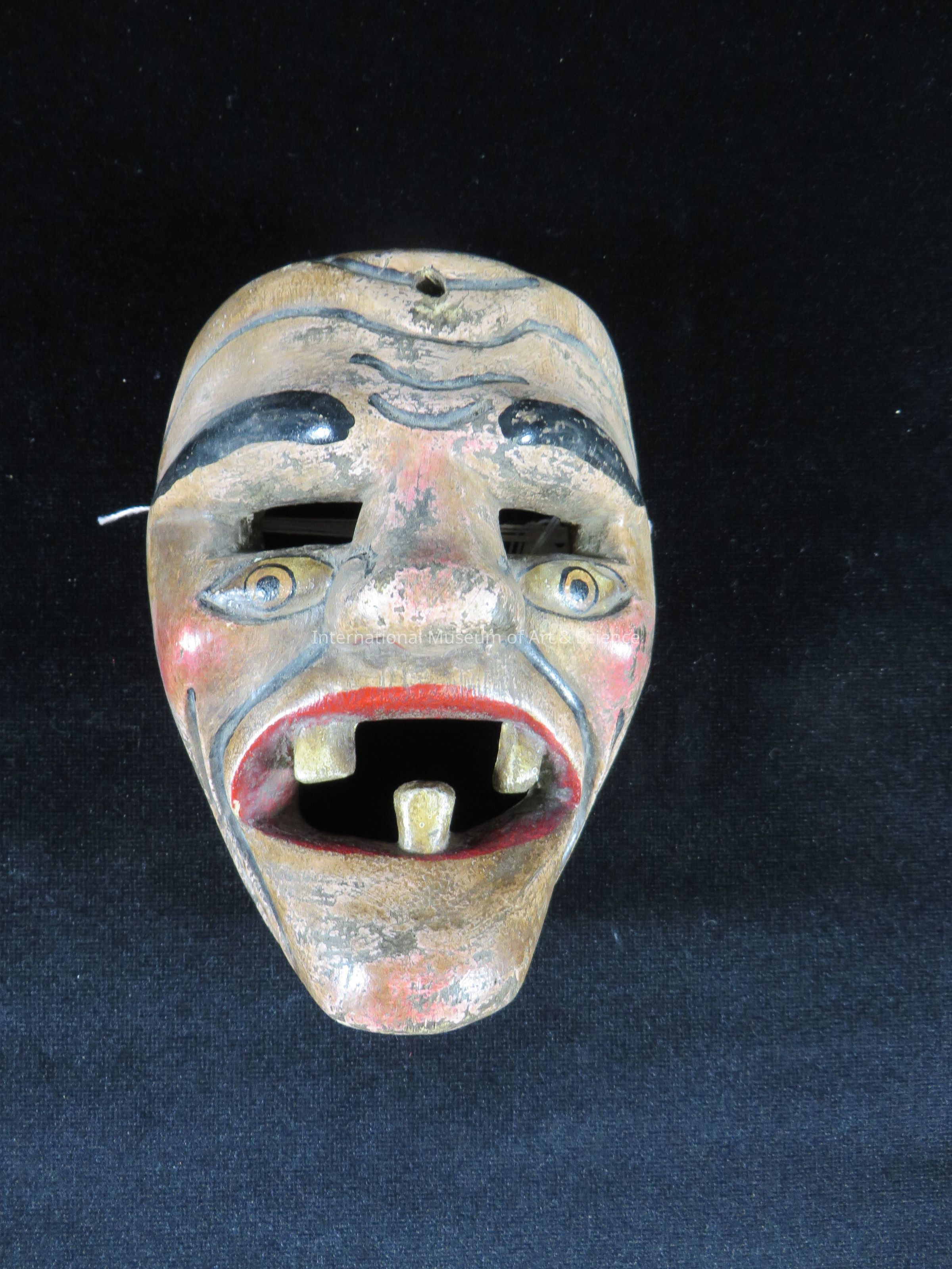 Mask. Painted face; dark with reddish nose and cheeks; pug nose, three teeth.