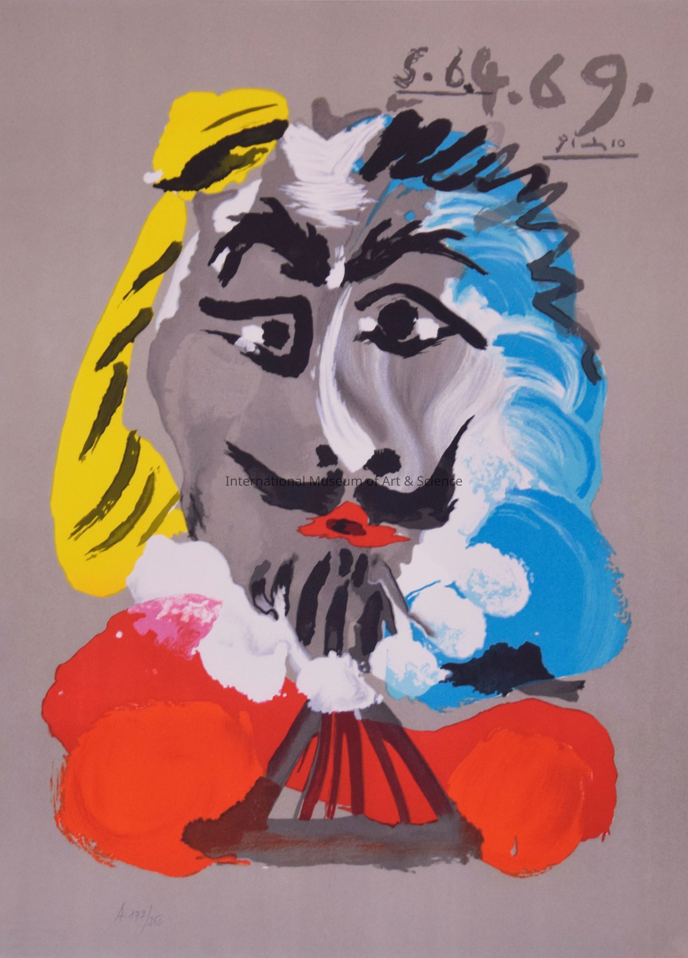 A lithograph print from the series of Imaginary Portraits, by Pablo Picasso, printed by Marcel Salinas. Distributed by Abrams Editions, New York. Signed Picasso in plate, upper right corner. Edition A177/250, embossed. The figure has gray face with red lips. Blue and yellow hair with red/orange clothes, and a white collar.Artwork Details