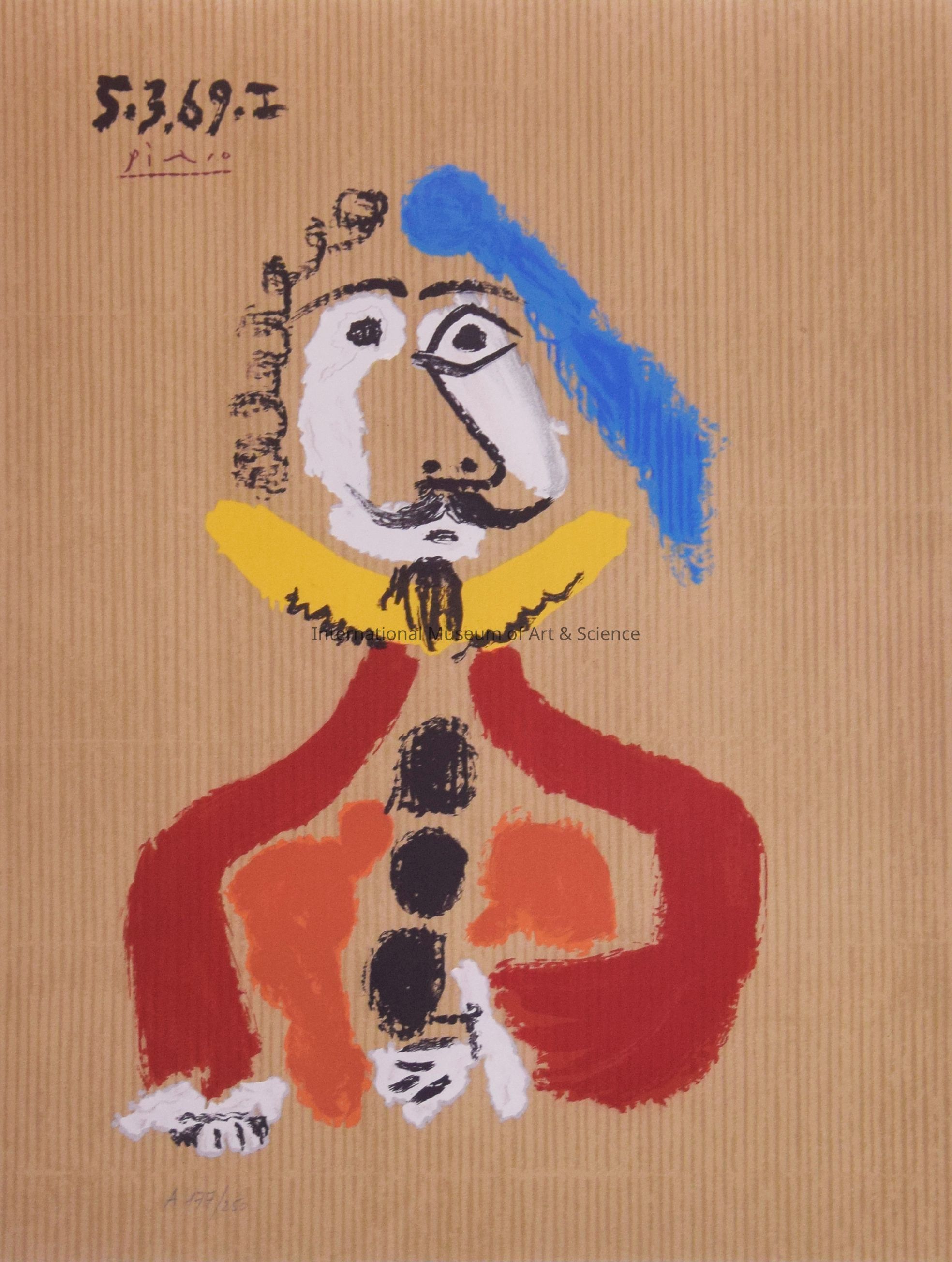 A lithograph print from the series of Imaginary Portraits, by Pablo Picasso, printed by Marcel Salinas. Distributed by Abrams Editions, New York. Signed Picasso in plate, upper left. Edition A177/250, not embossed. The figure has blue hair on left side of head and black curly line-hair on right side of head. He is wearing a gold collar, red and orange suit with white ruffled cuffs.Artwork Details