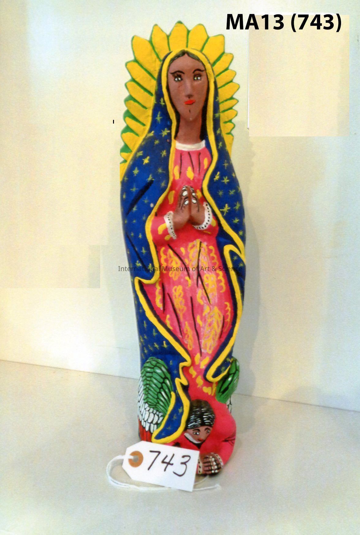 A wood carved figurine of the Virgin Mary. The piece is brightly painted. The dress is red, the sape is blue with silver stars. Around her head is a yellow rayed halo. The the base of the figure is an angel in a red tunic and green wings.Dimensions