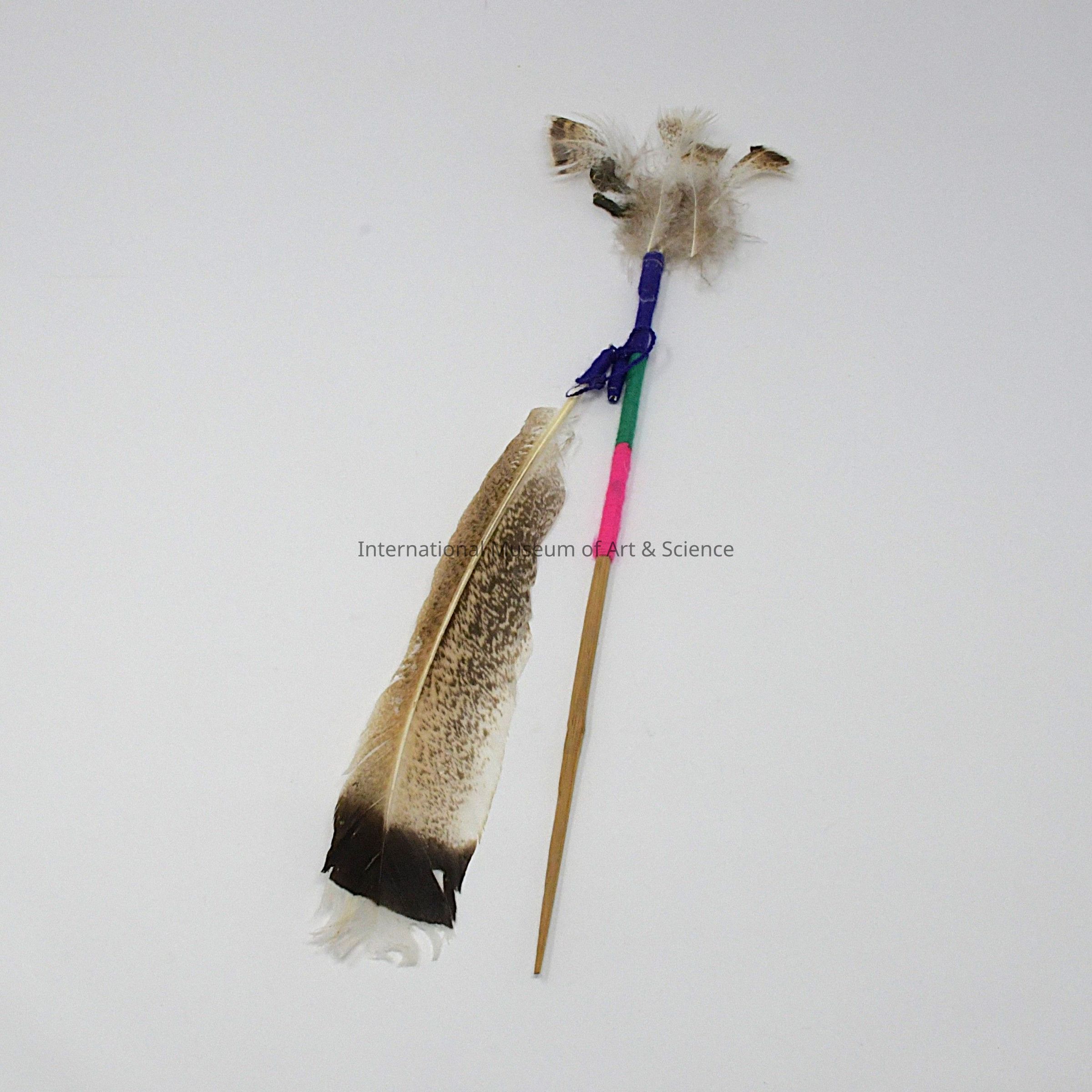 A ceremonial stick composed of a slender wooden shaft bound near the upper portion with colorful yarn in blue, green, and pink bands. Extending from the top are several feathers, likely from a bird of prey, with a brown-and-cream speckled pattern and dark brown tip. Additional smaller feathers, mottled brown and white are attached at the upper end, secured with blue yarn binding. Some remnants of organic adhesive, possibly kuetsukuai, is visible at the feather base. The overall condition shows light wear consistent with ceremonial use and age, with fraying yarn fibers and slight deformation of the main feather’s vane.Ethnography