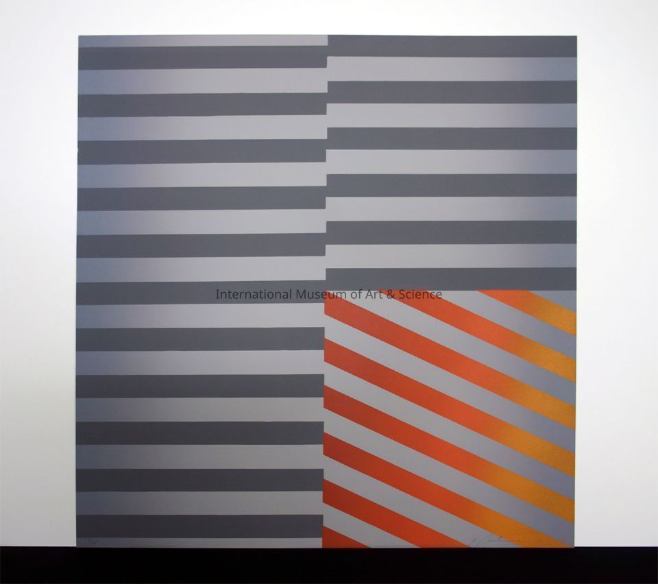 "73-5-1". Garo Antreasian, American. Lithograph. 1973. Multi colored lithograph with gradations; horizontal light and dark grey stripes; lower right section has slanted red-orange stripes with grey background; 7/15.