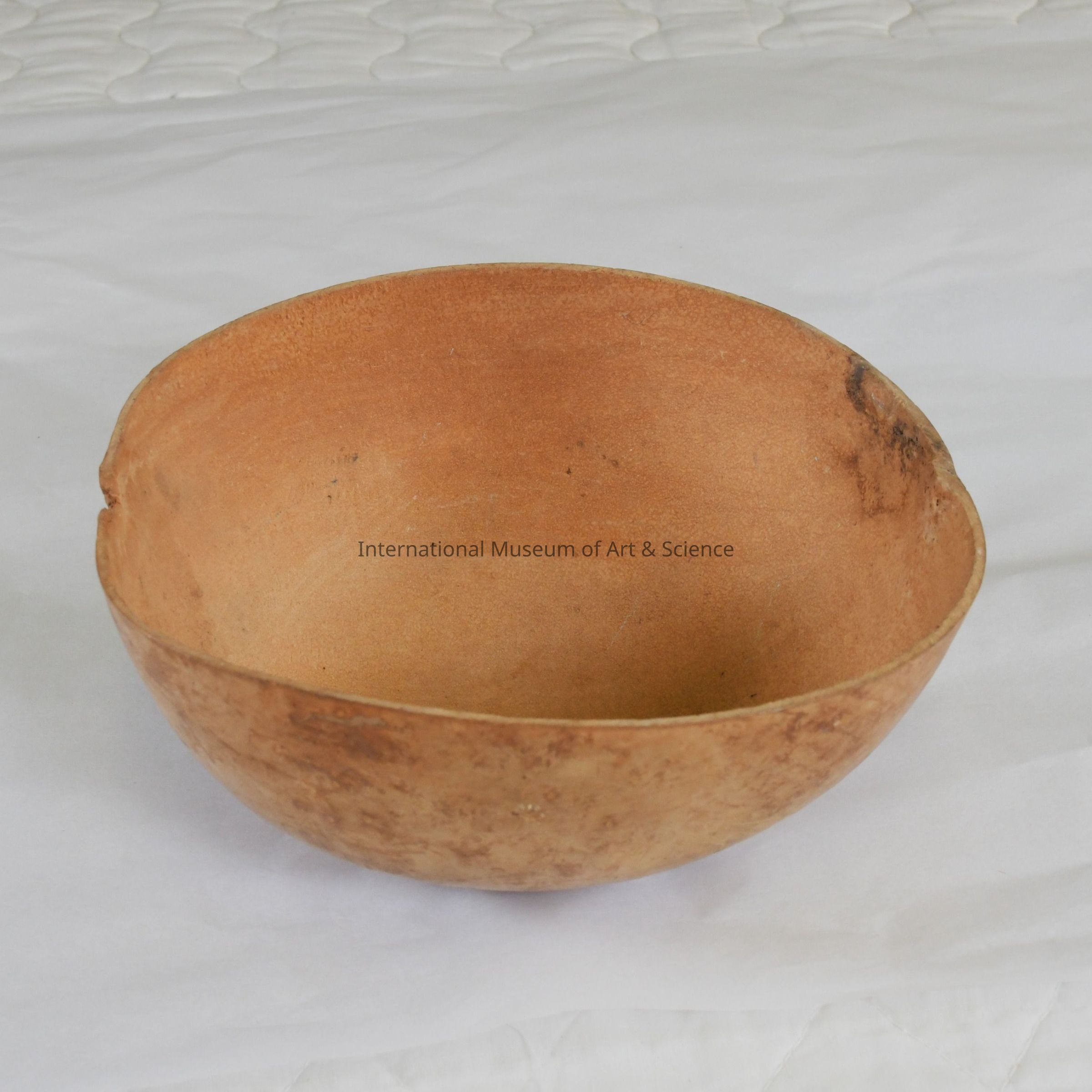 This hemispherical bowl is made from a dried and hollowed jícara (gourd), with its exterior and interior surfaces smoothed by scraping and wear. The edges are thin and slightly irregular, bearing the natural curvature of the gourd. The outer surface is mottled brown with clear signs of age and use, including abrasions and minor discoloration. The interior is a lighter tan and more finely finished, with a subtle sheen from repeated handling or contact with goods. One rim section shows a small natural fracture or indentation, consistent with hand-cut shaping.Ethnography