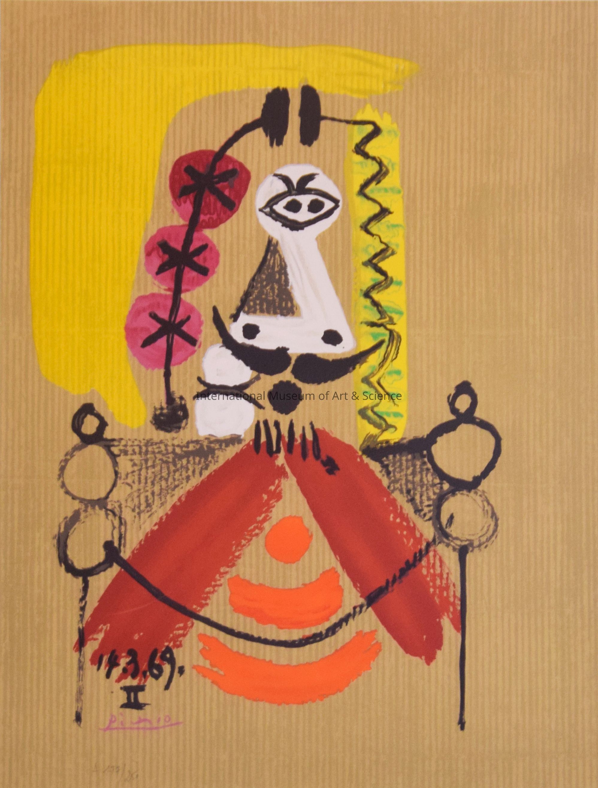 A lithograph print from the series of Imaginary Portraits, by Pablo Picasso, printed by Marcel Salinas. Distributed by Abrams Editions, New York. Signed Picasso in plate, lower left corner. Edition A177/250, embossed. The figure has yellow hair, with orange and red clothes. There are 3 crimson balls with X marks inside located on right side of face and 3 black circles stacked vertically on both shoulders.Artwork Details