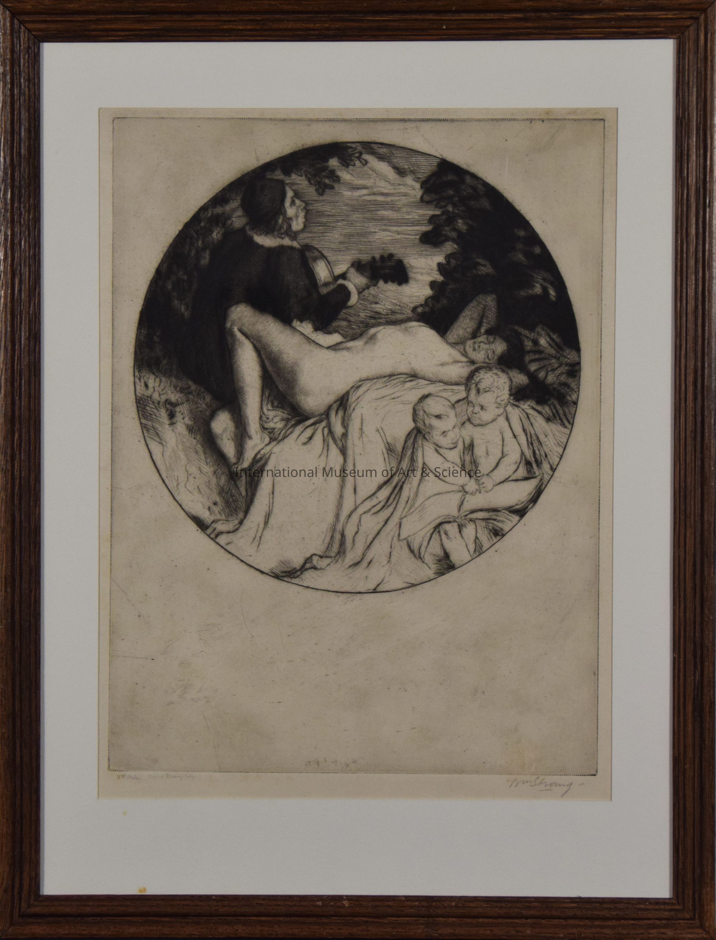 "A Love Song" - Strang, William. Musician reclining nude, cherubs, black and white.