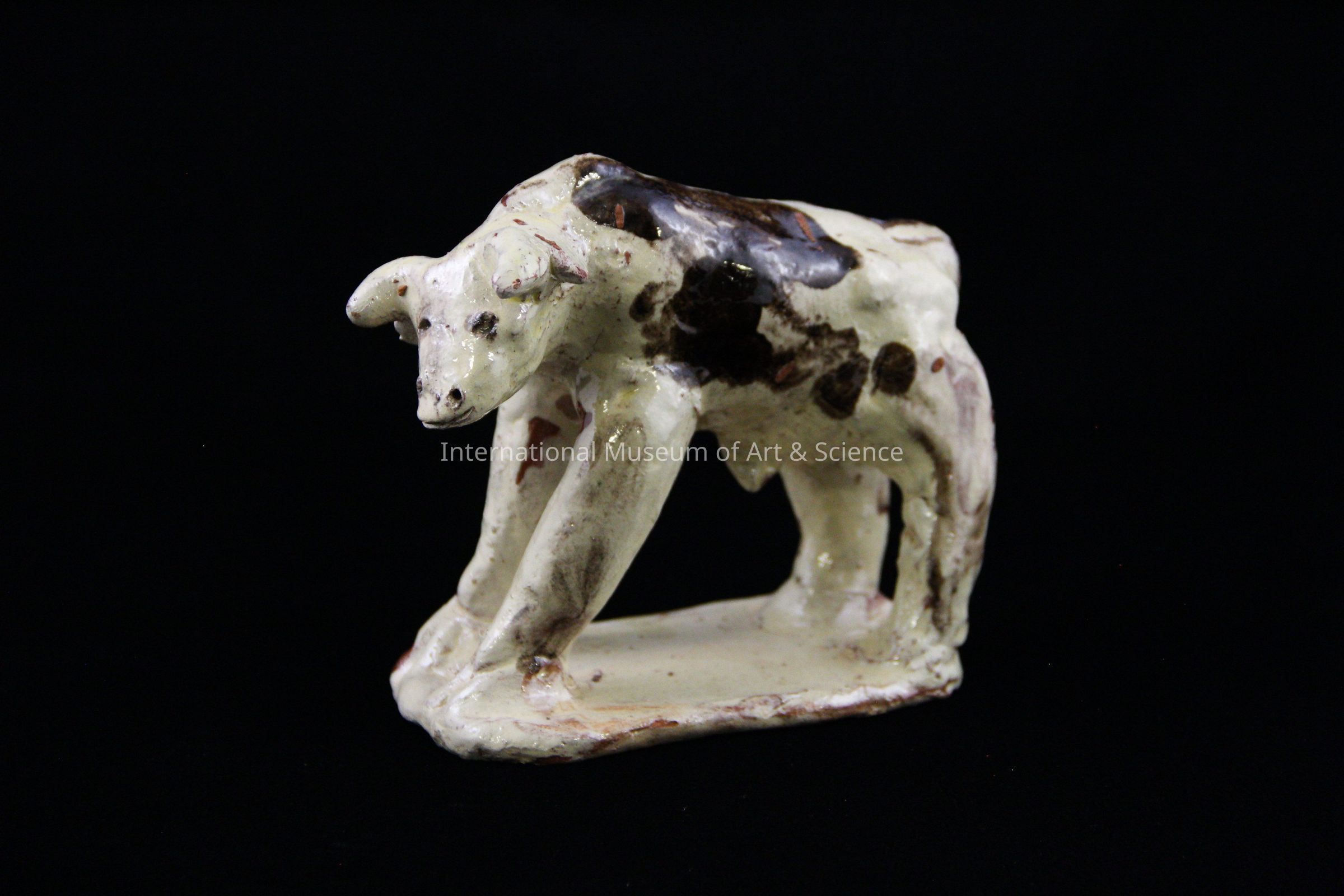 A bull figurine. It has a cream background, with dark and light brown on his body and legs. It has a long narrow tail curled downward, pointed horns, and stands on rectangular base. Part of a group of animals from a Nativity scene.Ethnography