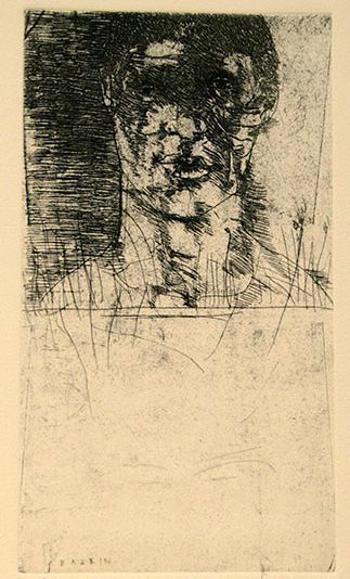 "Aaron". Leonard Baskin, American. Ink Print. ca.1970. From Gehenna Press Titus Andronicus portfolio. Upper part of print shows bust of young man, has short wavy hair, wide set features; bust is met by shadowy area on left which covers upper left of painting to edges; lower area of print is left blank except for several vertical marks between the composition and blank areas.Dimensions