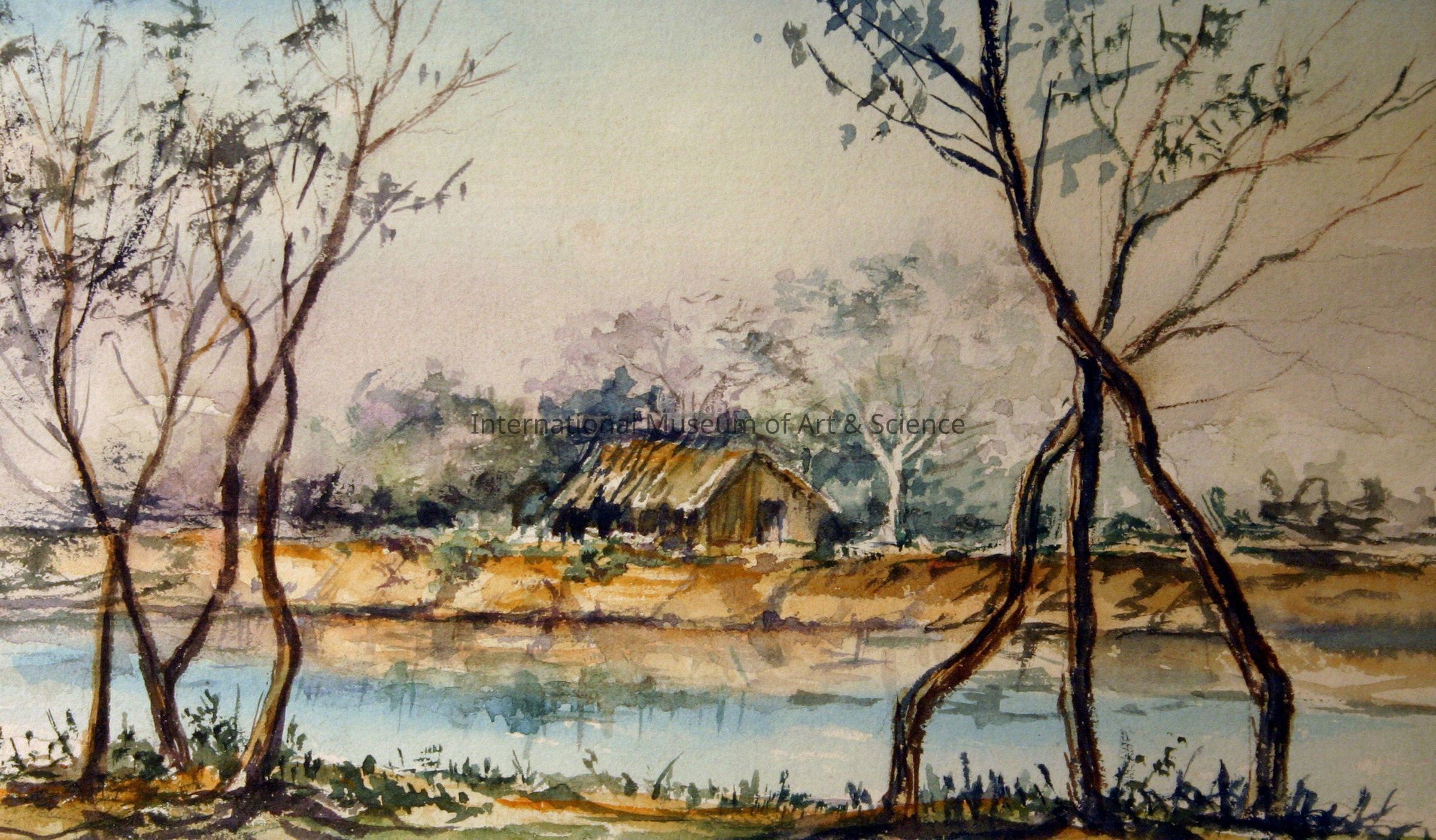Across the Rio Grande. Landscape watercolor painting blue lake with tall bare trees on one side and across is a small house at a distance; clear skies; numerous trees surround the house.Made/Created