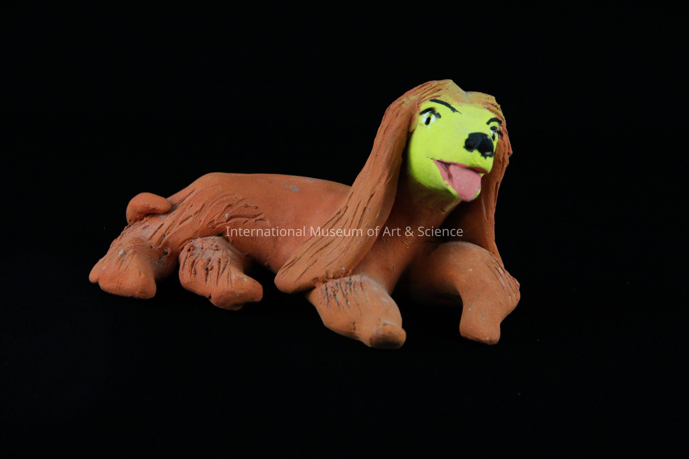An orange ceramic figurine of an Afghan hound dog. The dog is painted orange with a yellow muzzle.