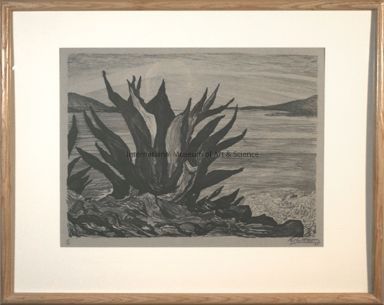 "Agave Plant." Pablo O'Higgins. Lithograph. 1949. Early Modern art piece on rectangular shape paper; Off-white color mat board; Black and white image of an agave plant in a traditional Mexican landscape. Framed, 18/40.Dimensions