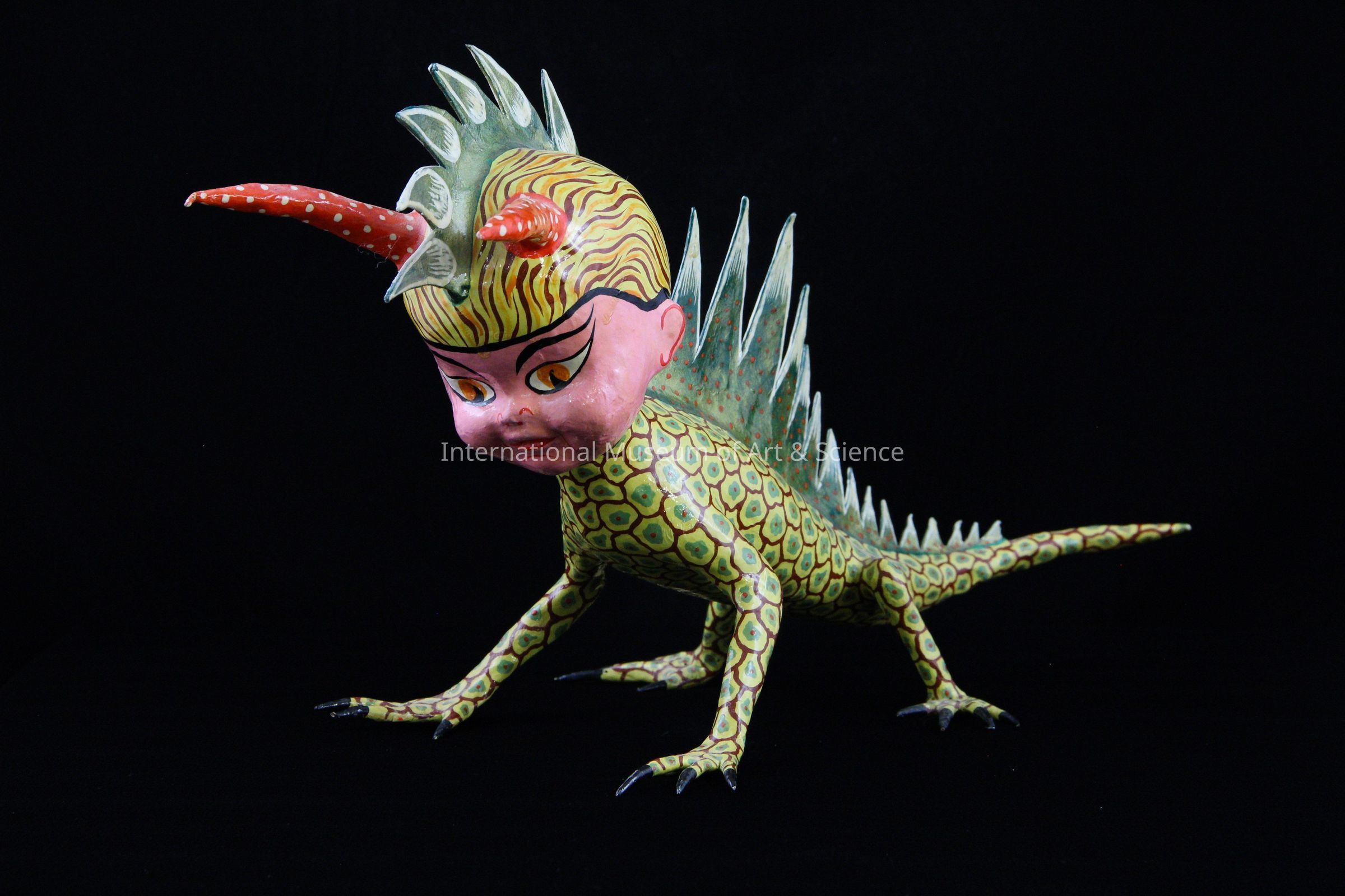 A papier-mache alebrije figurine. The figurine has a face of a baby with the body of a chameleon lizard. The face is painted a fleshy pink, with the body in different greens with patterns, and red horns on the head.Artwork Details