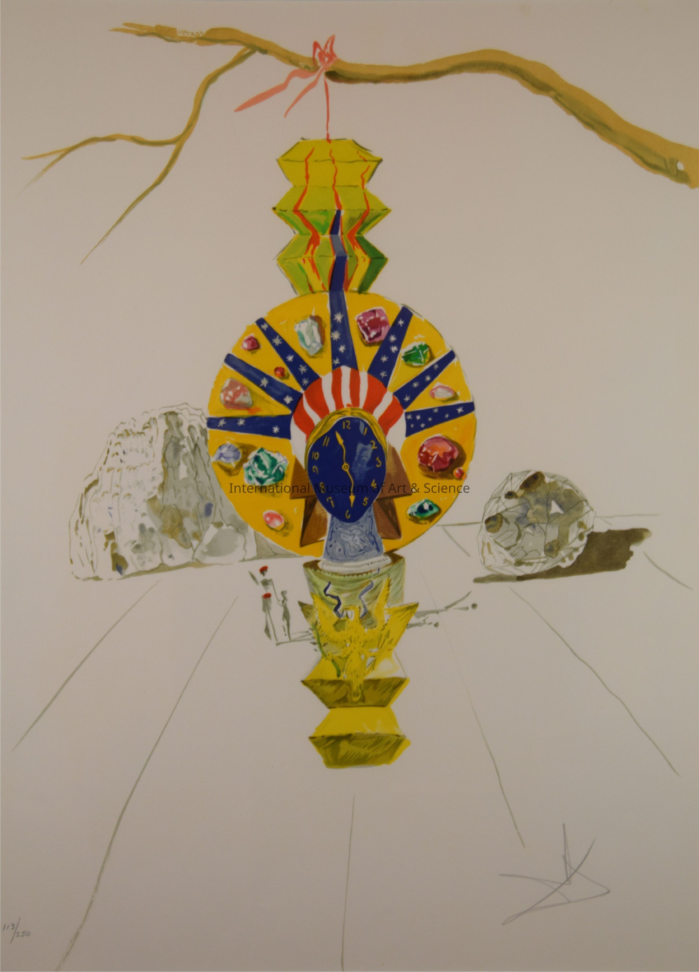 One point perspective print with focus behind head of Statue of Liberty with face of a clock, which is on a pedestal; Statue of Liberty has blue clock face with gold numbers and wavy hands; gold hair shown underneath headband of red and white stripes; crown of "Liberty" shows points of blue with white stars and a gold halo encircles head; directly behind face of clock are two brown overlapping pyramid bottoms; neck below clock face is a faux marble; pedestal is of gold and green, is made of 3-D geometric shapes shadowed from overhead light source; pedestal continues above "Liberty", repeating geometric forms and stripe from blue crown point continues into upper shapes; lines of perspective drawn from edges of lower part to point behind head; two rock/ ice shapes located on sides of pedestal in washy look; washy mother/ child in small scale on left of "Liberty" cast shadow right; tree limb with branches springs from right and has a bow in red over center of print, over statue, Signed. 113/250.Dimensions