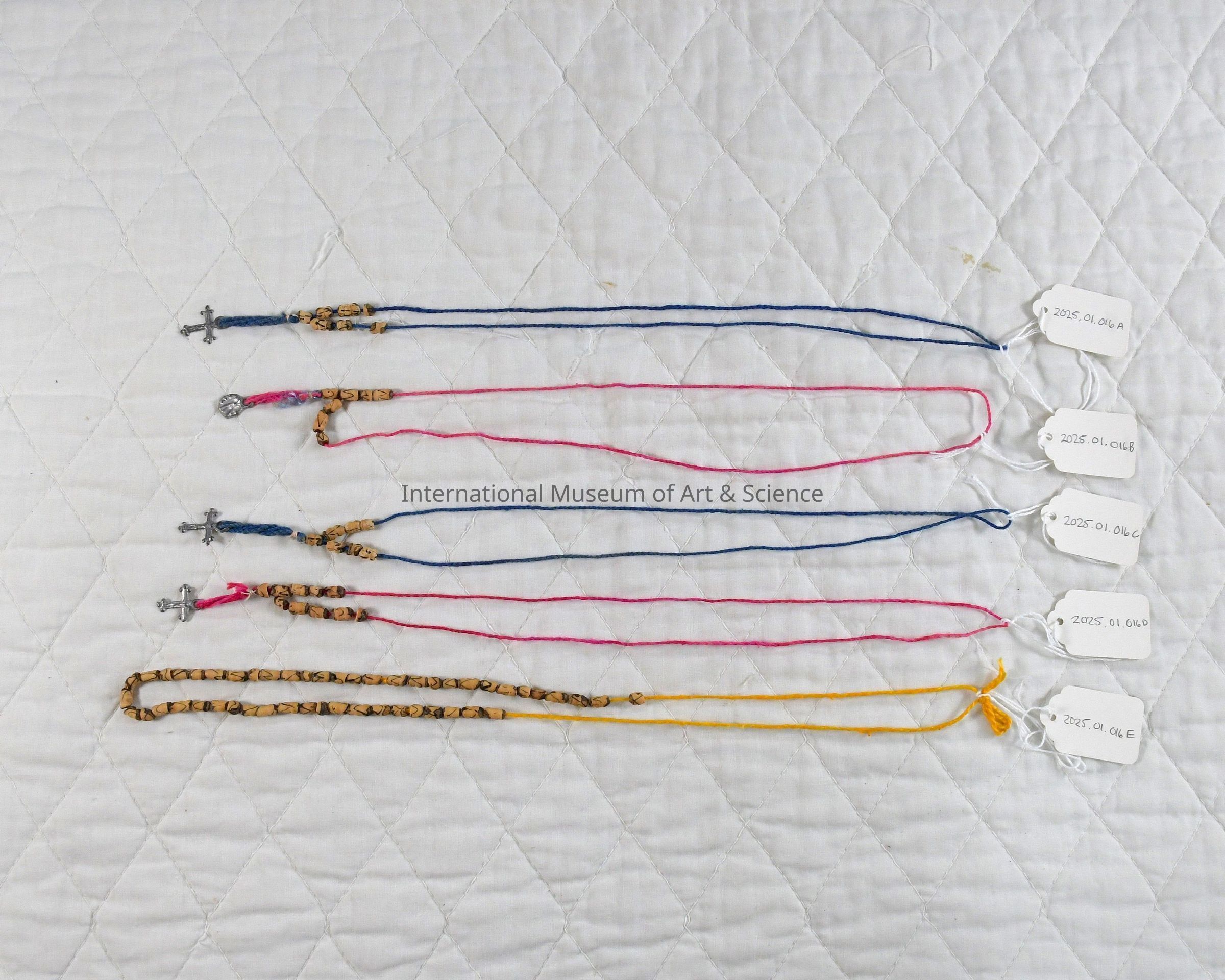 A set of five handmade amulet necklaces featuring beads crafted from natural seeds or small carved wooden elements, strung on dyed cotton threads in blue, pink, and yellow. Each necklace incorporates a small metal cross pendant or religious medallion, except the yellow-threaded necklace, which is strung entirely with beads. The amulets are lightweight and modestly ornamented, reflecting the artisanal traditions of Oaxacan marketplaces. The seed beads exhibit natural variations in tone and burn-pattern markings, suggesting hand-finishing techniques.Dimensions
