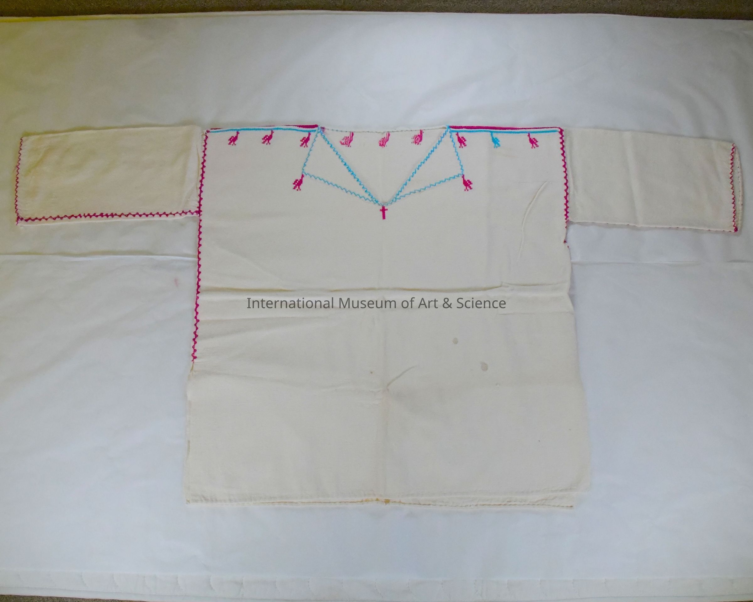 The cross-stitched birds are similar to those added at neckline to handwoven woman’; huipil in the same village. The cross may be a request from the wearer or a signature feature of the weaver.Ethnography