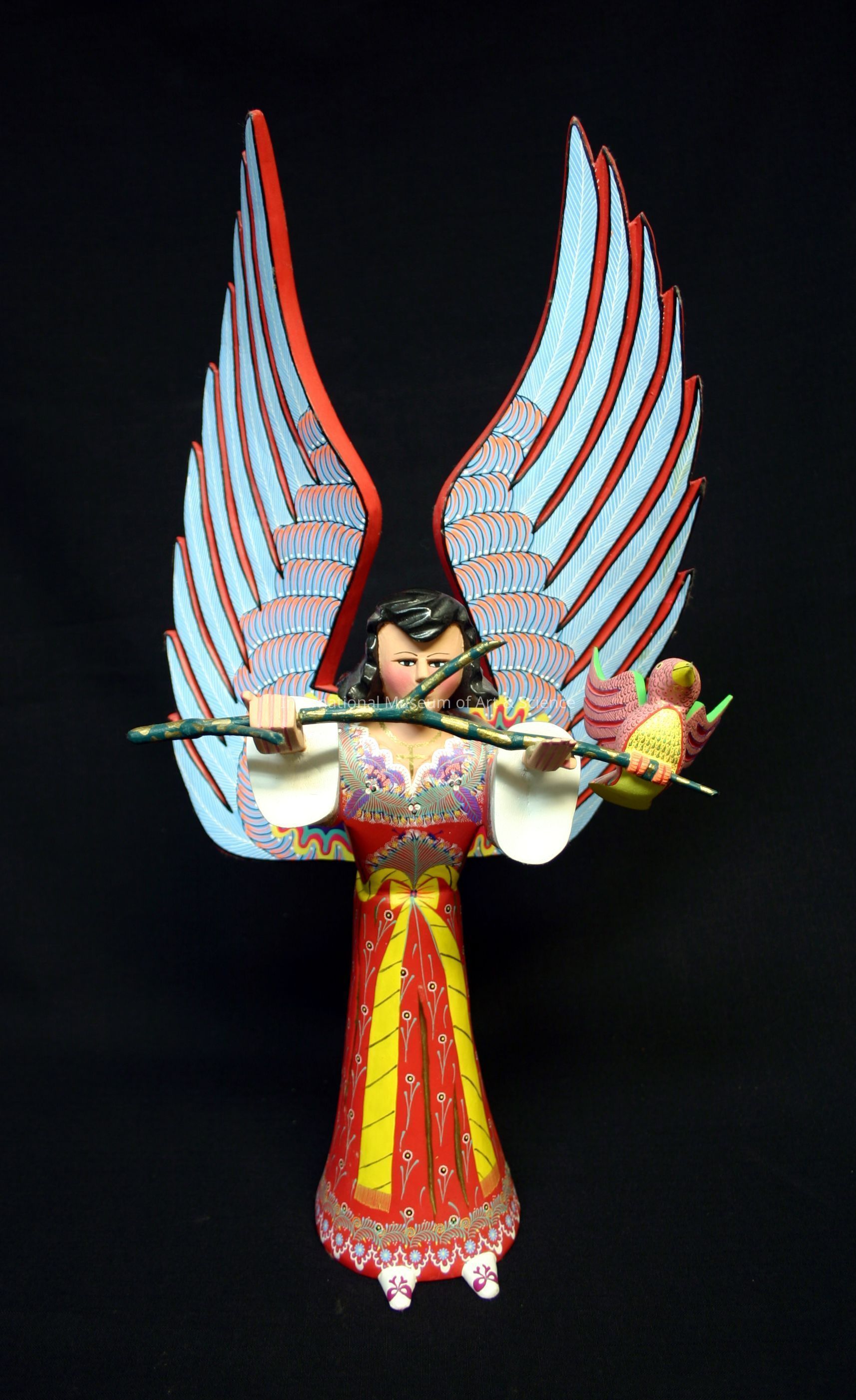 Angel. Mexican hand painted carving with black hair and pale pink/beige face and hands in red robe with blue-green, light blue, violet, white, and pink embroidery along collar and hem with a yellow belt tied in a bow. Red trimmed light blue wings extended and arms outstretching holing a blue-green and gold branch with a pink, light-green, yellow, and red bird on right with wings extended.