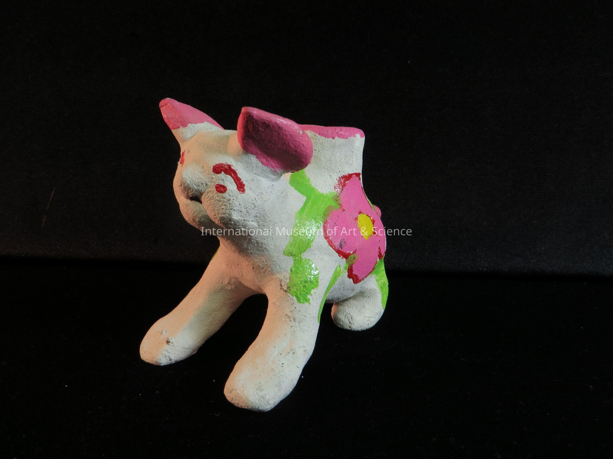 Animal candleholder. Made of clay painted white, with bright pastel colors; animal appears to be a dog with pink ears and tail; bright pink flowers and light green stems painted on his doby; candleholder attached to his center back; holder with pink rim.Dimensions