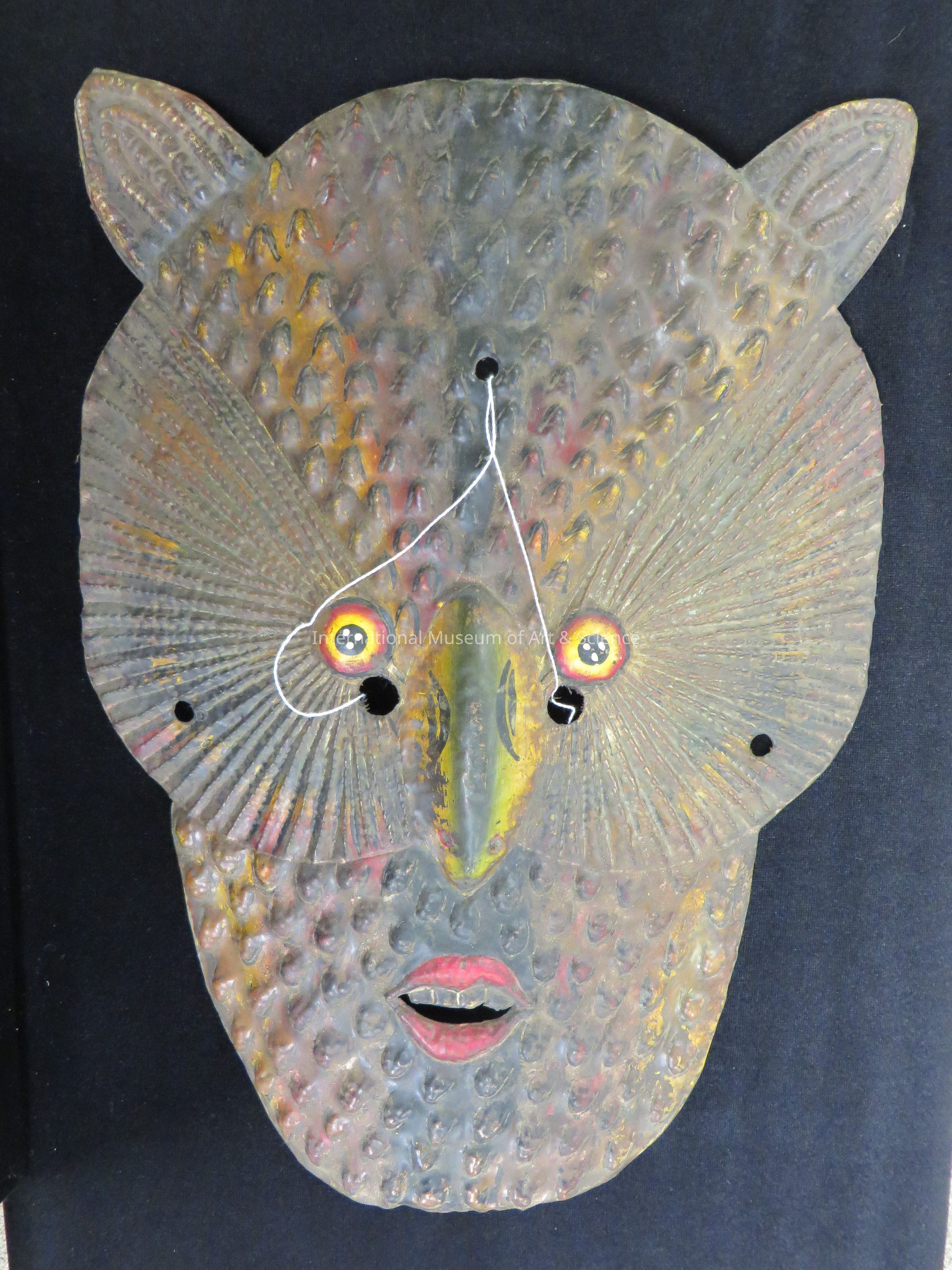 Animal/face panel. Large owl's head with orange eyes, repossed feathers in mixed colors; short raised beak. Detalis worked in repousse and paint; cloth-lined interior; design of a central owl face with orange eyes, reposse feathers in mixed colors; short raised beak, red open-mouth expising four upper teeth; small chin cup soldered in the back.Artwork Details
