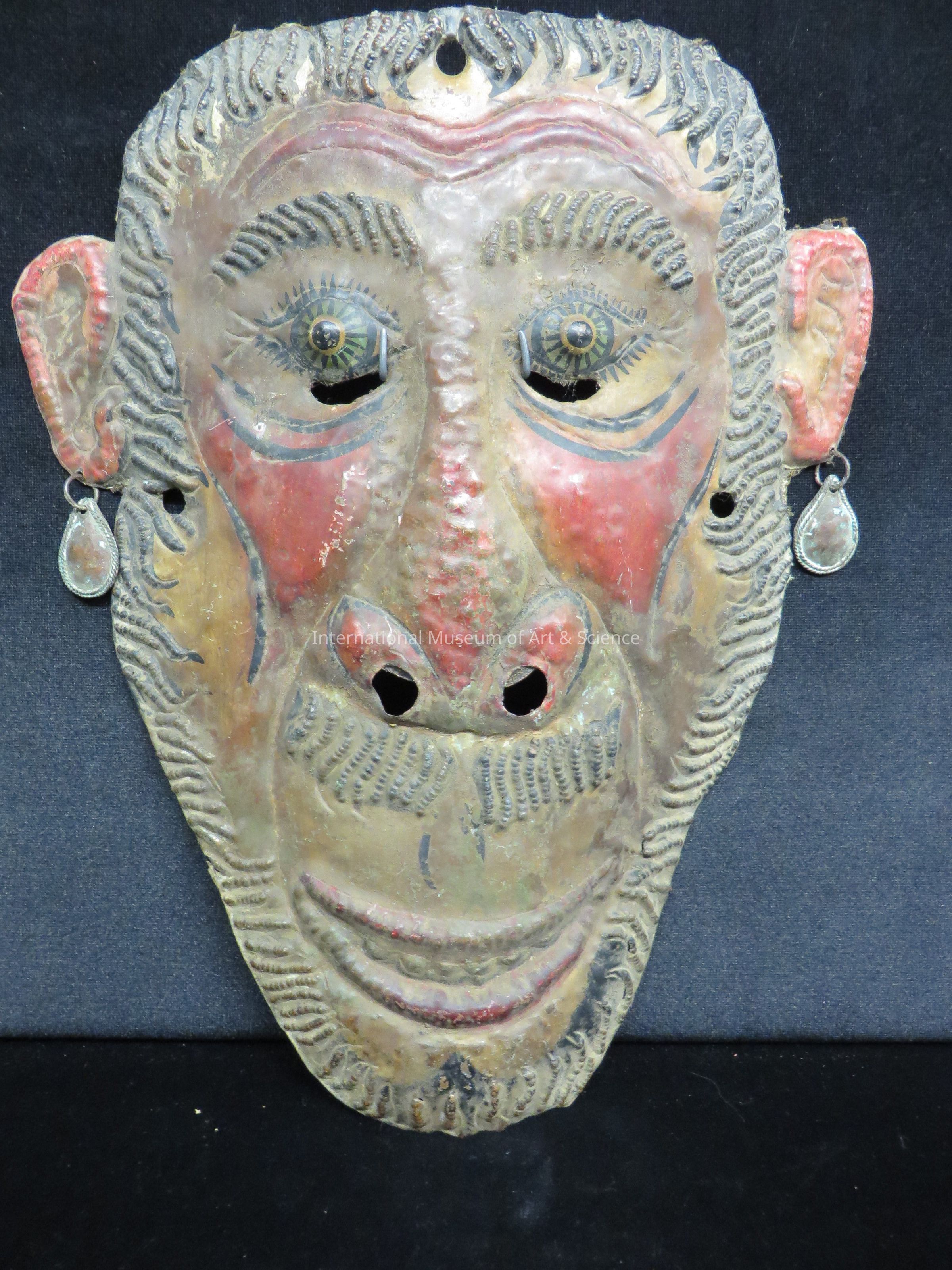 Animal/face panel. Oval hammered sheet; design of a monkey face with black green eyes; small copper bells on the lobes. Animal face panel. Oval hammered sheet copper animal face panel; head of a mono (monkey). Details working in repousse and paint; cloth-lined interior; design of a monkey face with black-green wyes, heavy black brown, red crescent mouth exposing teeth; reddish-pink ears; small flat oval copper bells on the lobes; flat top with black hair sideburns, moustache, jaws, chin area; prominent nose; small chin cup soldered on the back.Artwork Details