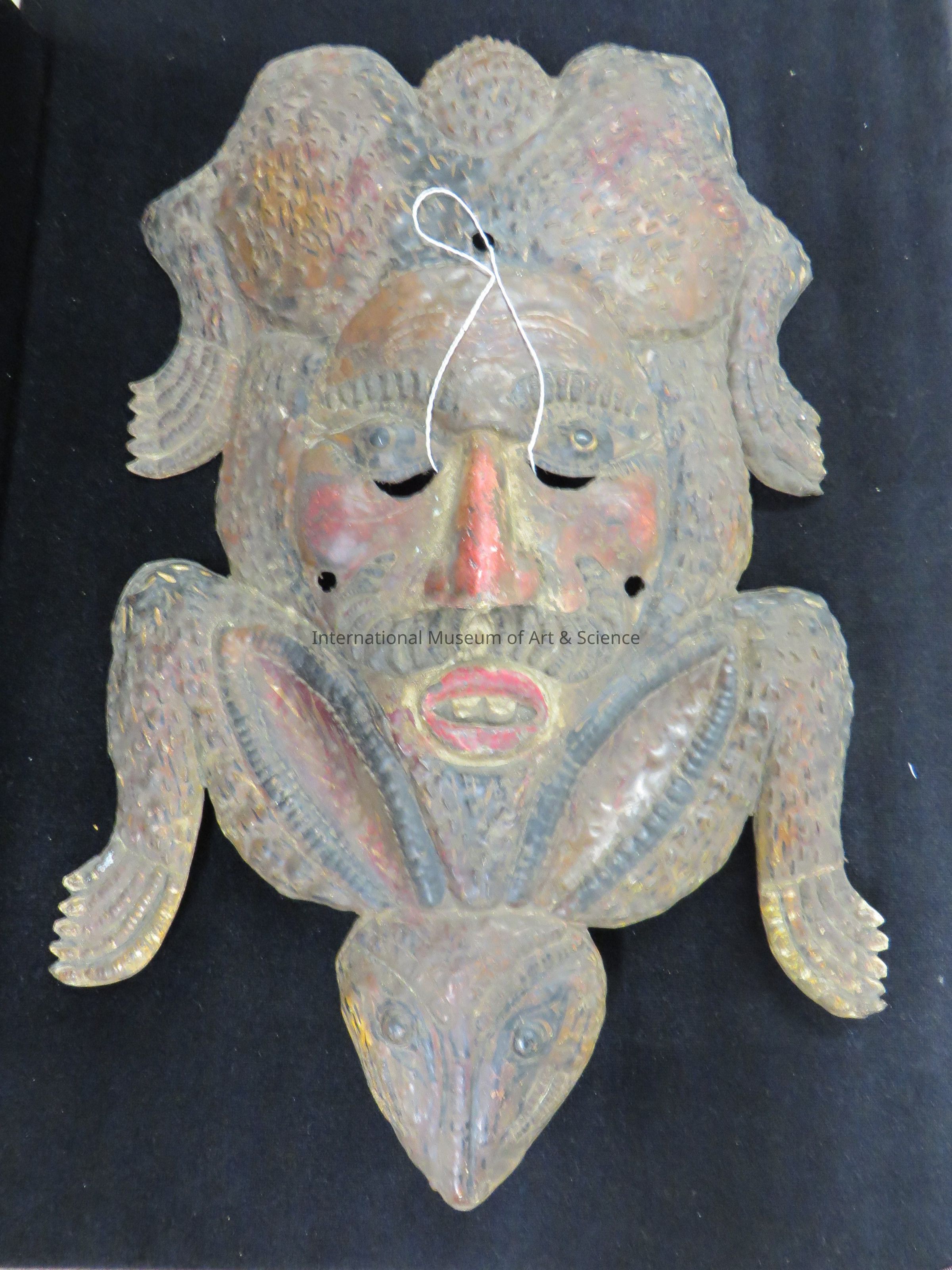 Animal/face panel. Large hare's body with a design a central human face; hare with ling ears. Detalis worked in repousse and paint; cloth-lined interior; design of a central face with black eyes, heavy black brows; prominent nose, red oval mouth exposing two teeths black moustach curled upward, reddish face color; large cut-out head, legs and tail of a here body form; hare painted black with flat long ears; small chin cup soldered on the back.Artwork Details