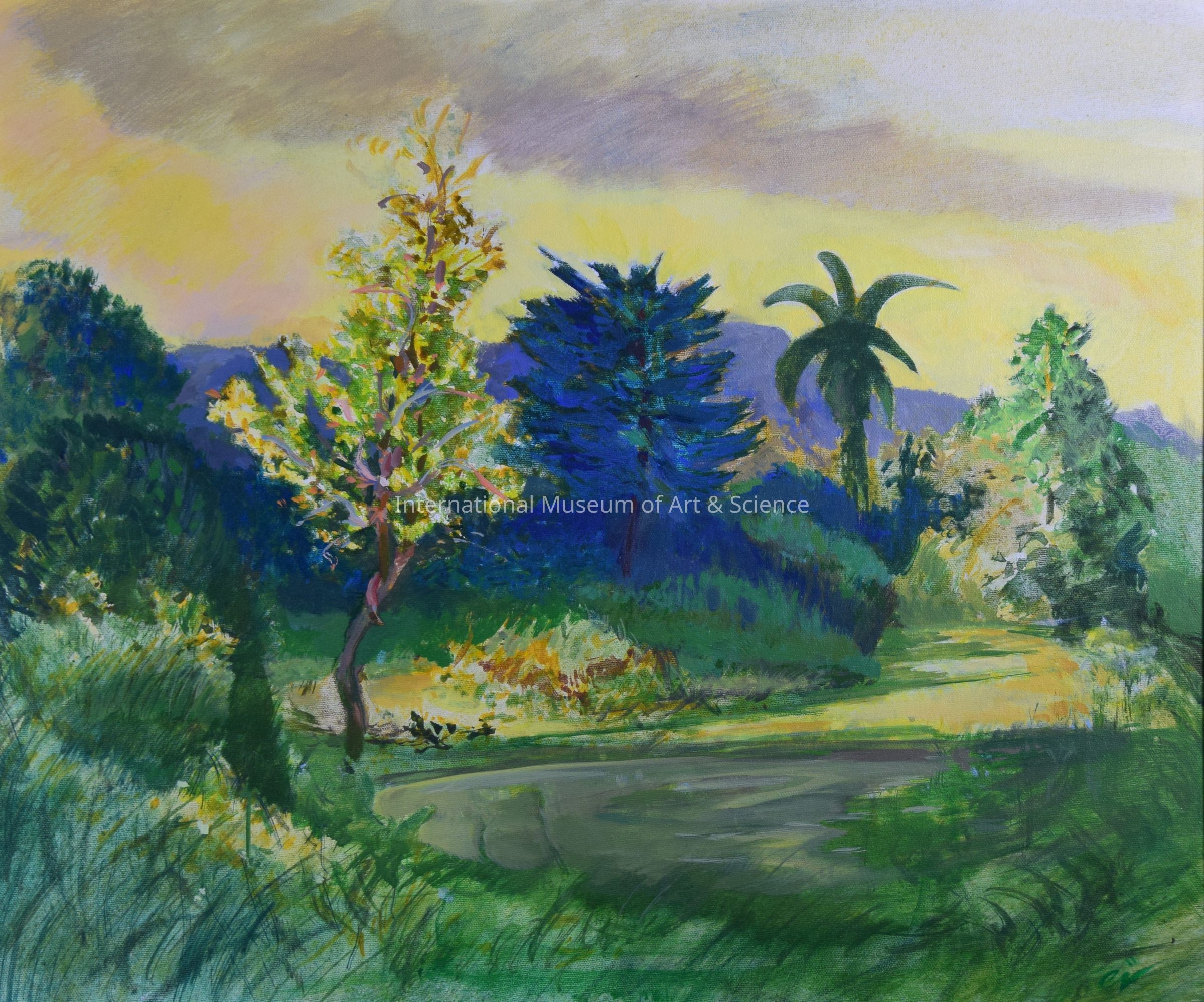 "Anzalduas Park". The painting depicts a pond with trees at its edge. with hils in the background. The piece is done with bright blues, yellows, and greens.Artwork Details