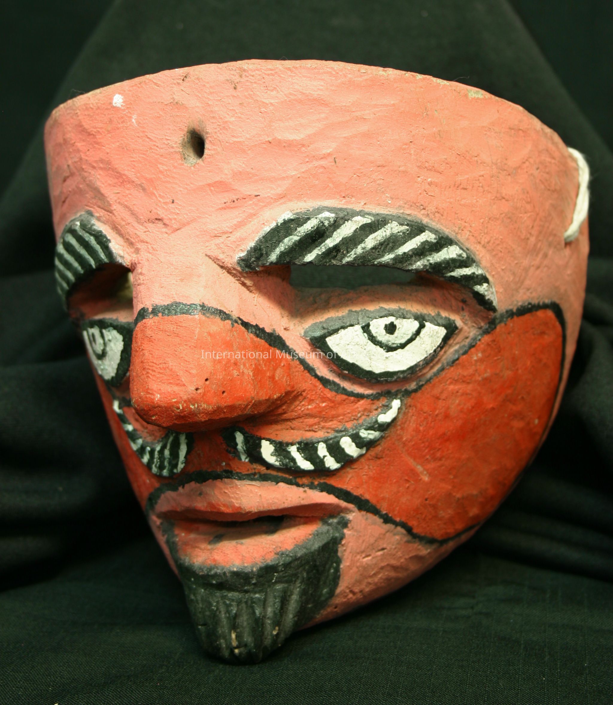 Apache mask. Apache mask has face in shades of pink & red. Small black beard, wh ite and black striped eyebrows and moustache, blackand white crescent eyesMade/Created