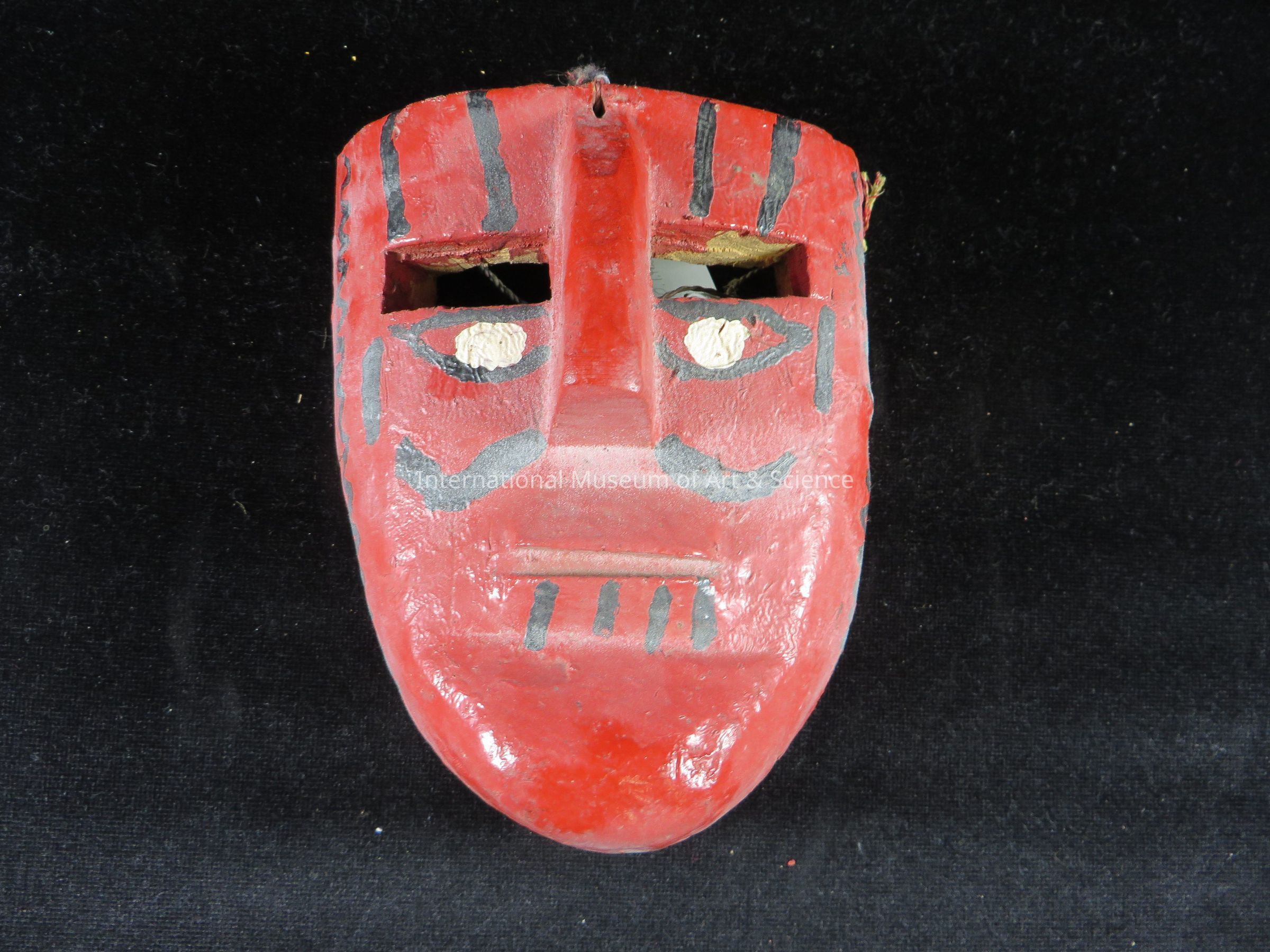 Apache mask with bow. Mask overall red face with black markings and moustache; white circular eyes; bow arrow naturel color; bow has red, beige, and peach stripsArtwork Details