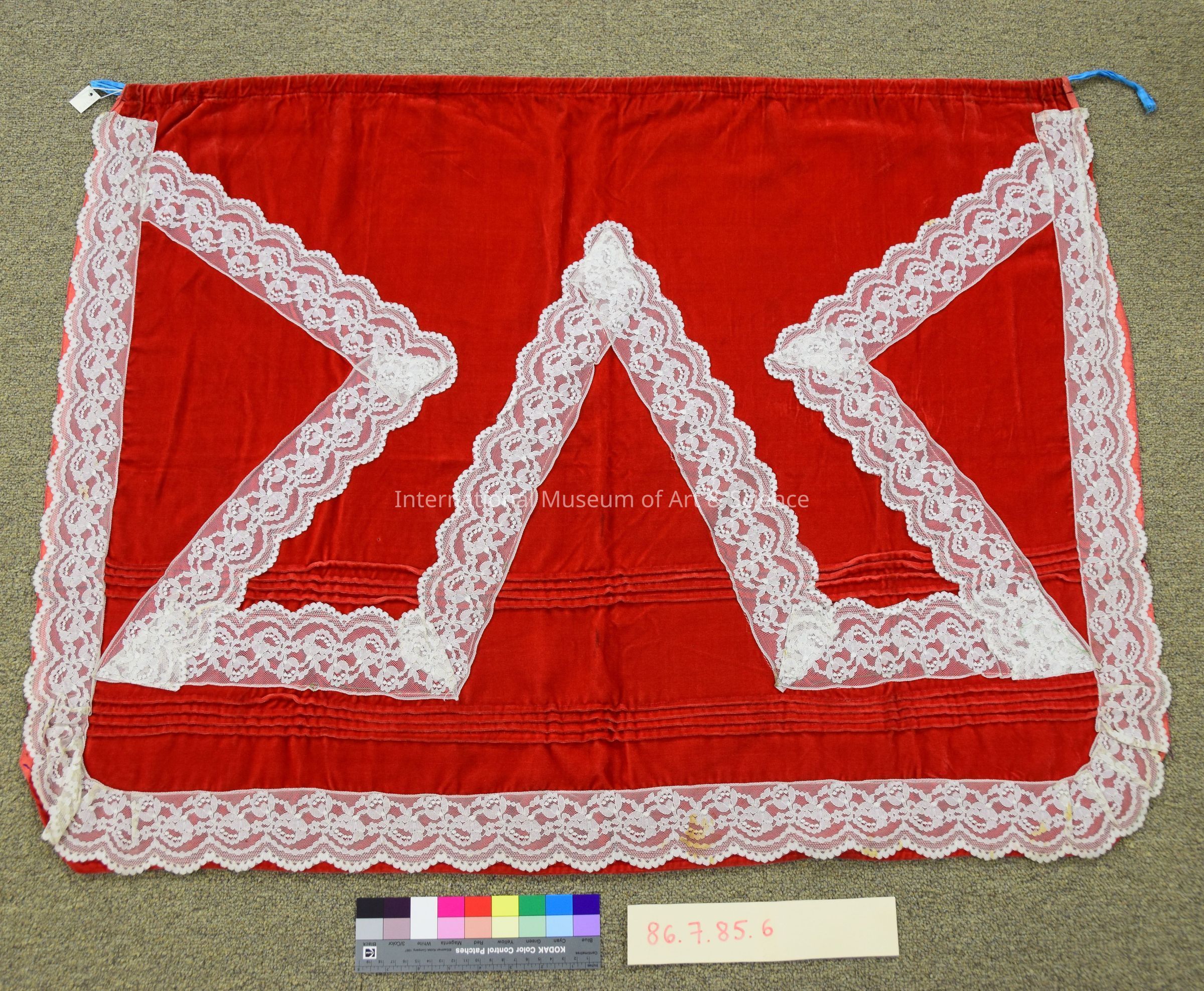 Apron. Rectangular waist apron made in red velvet with white lace applique. The lace is machine made tape lace with a scalloped edge. One tape piece runs from one side down to the hem and up the other side, and others are arranged centrally to create a geometric design. 2 sets of four pin tucks decorate the bottom half of the apron, running horizontally. A blue satin ribbon works as a drawstring along the top edge. The bottom edge is hemmed but its two side seams are untouched selvages.