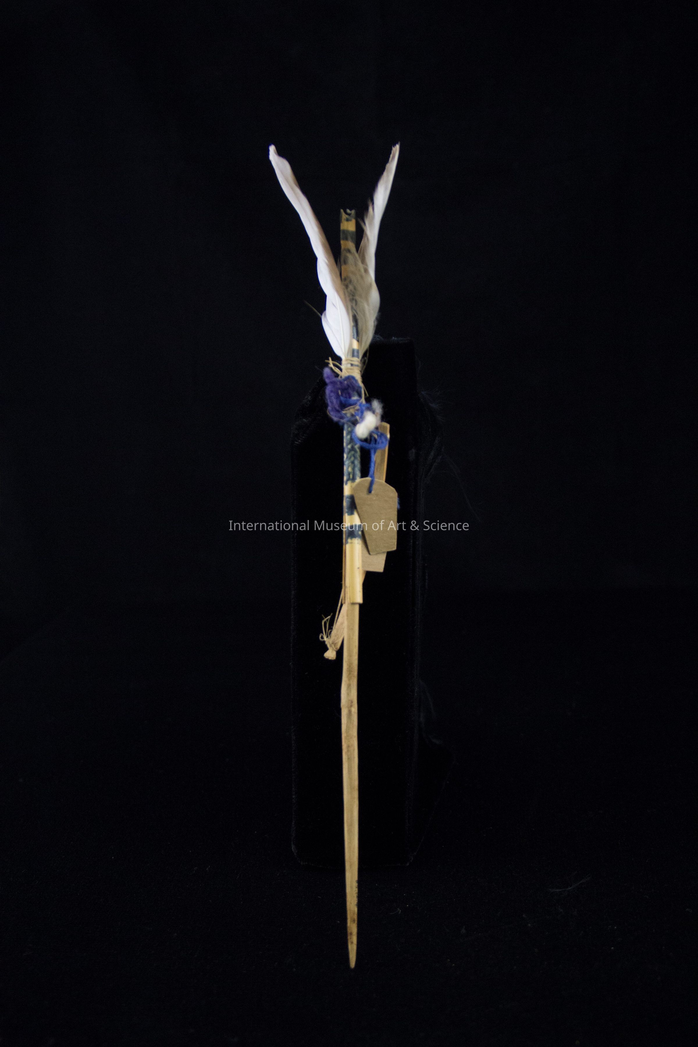 An arrow. The arrow is decorated with blue designs at the top, two feathers attached to the top with yarn, and two pieces of cardboard tied on with blue string.