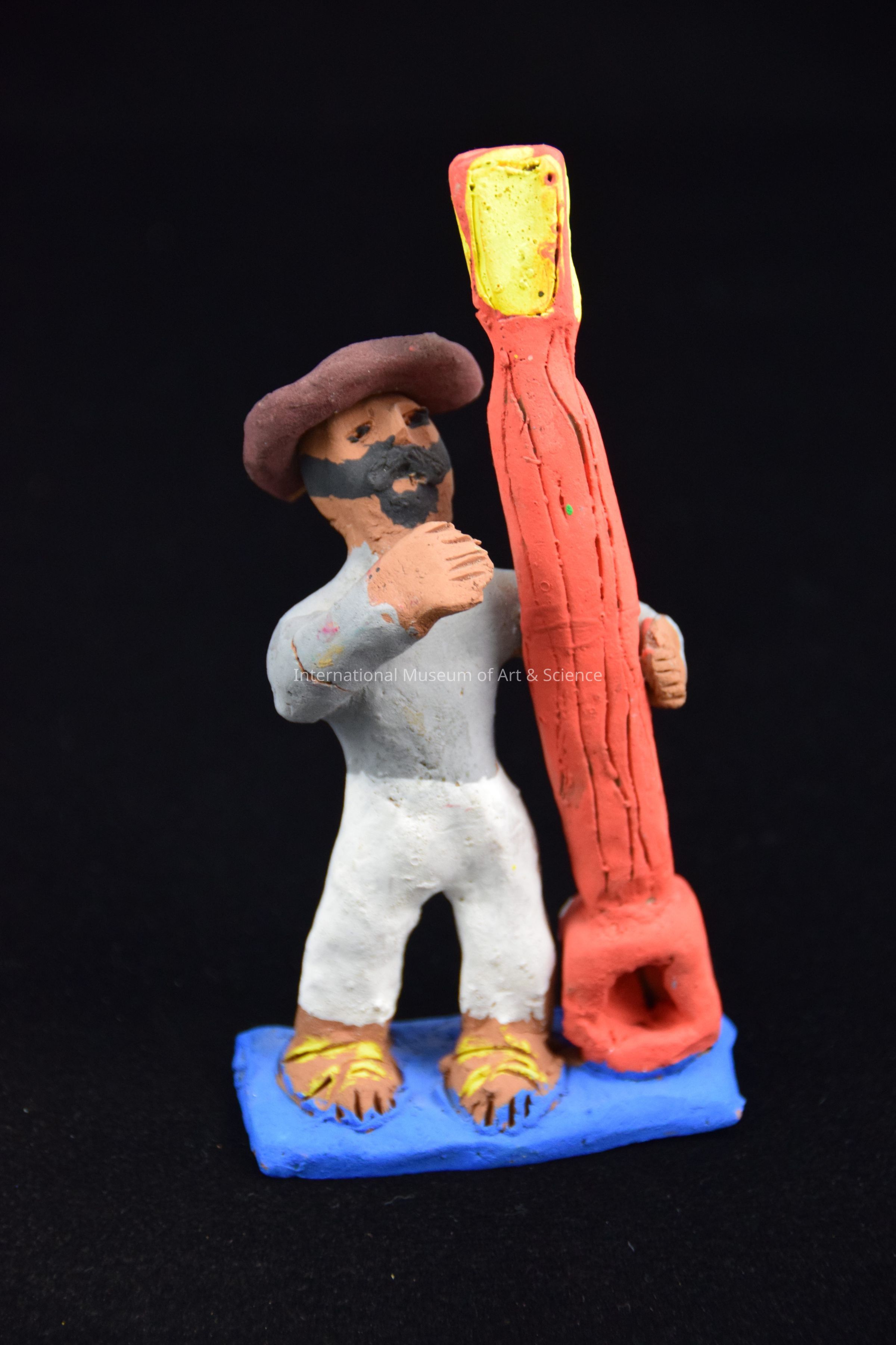 Clay figure of a man wearing white pants and a gray shirt holding onto a lamp post. He is part of a Zocalo scene. The scene has 28 clay pieces brightly painted, representing a park scene.