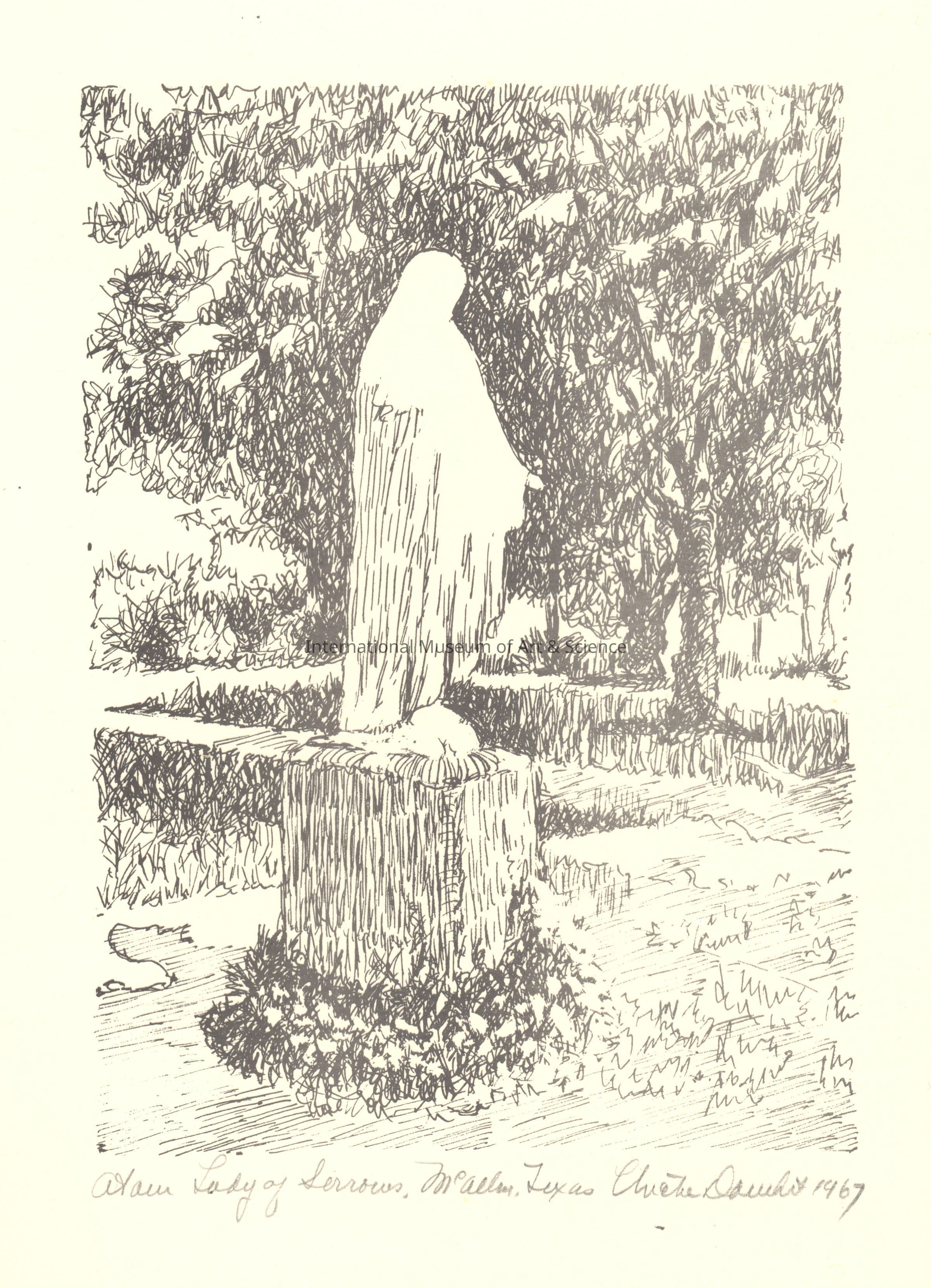 "At our Lady of Sorrows, McAllen, Texas." Depicts statue of woman amongst trees on grounds of church at 1108 Hackberry, McAllen. Black ink on buff paper.Dimensions