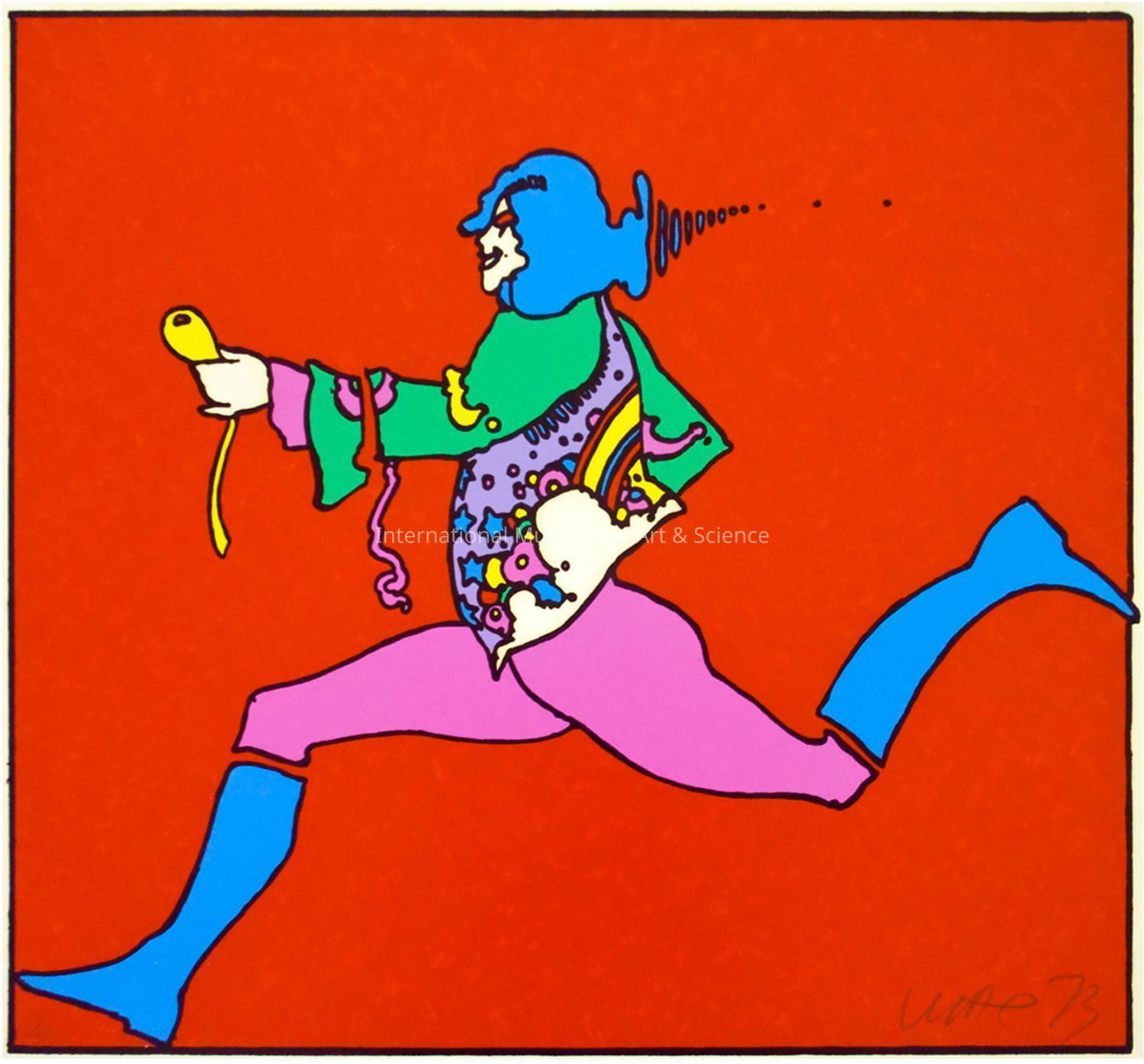 "Atlantis Runner" Red background with running figure wearing multi-colored coat and blue hair; 213/300.Dimensions
