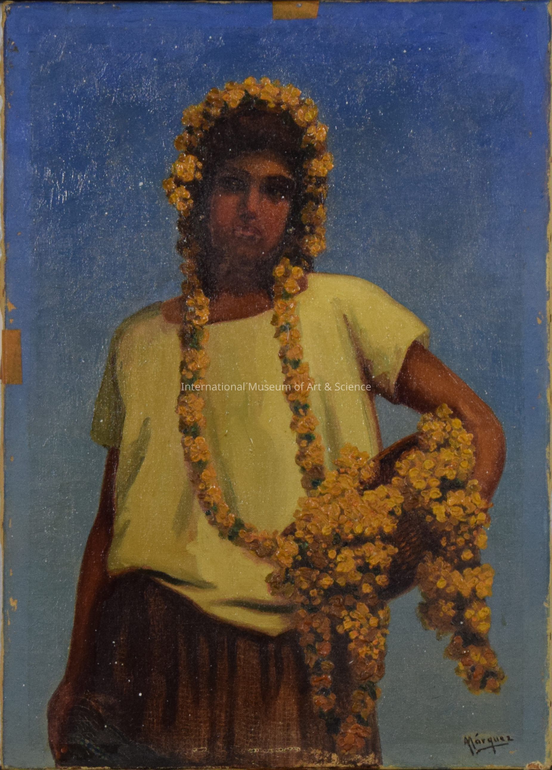 A painting of a woman with yellow flowers in basket. The young woman is wearing a white blouse and a brown skirt. She has yellow flowers around her neck and in her hair.Made/Created