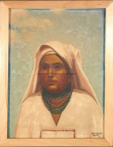 A portrait of a woman wearing a white blouse with red detailing, multiple beaded necklaces, and a white cloth headcovering.Made/Created