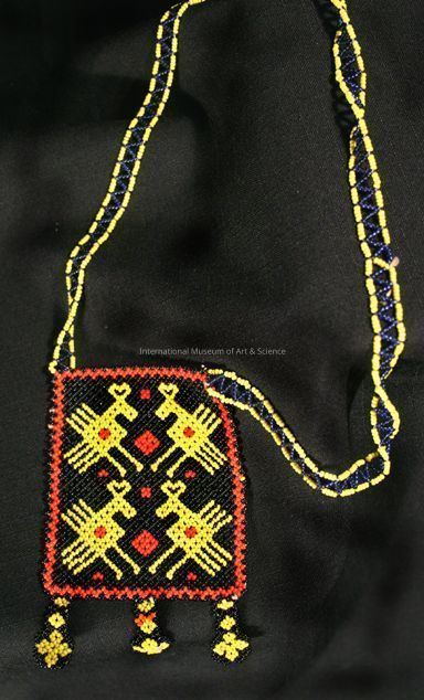 Square center with red border, black background with 4 yellow animals (birds), 2 red diamonds, 6 red spots; has 3 extensions on bottom of square in yellow and black, one with orange beads; the strand is made of yellow and blue beads.