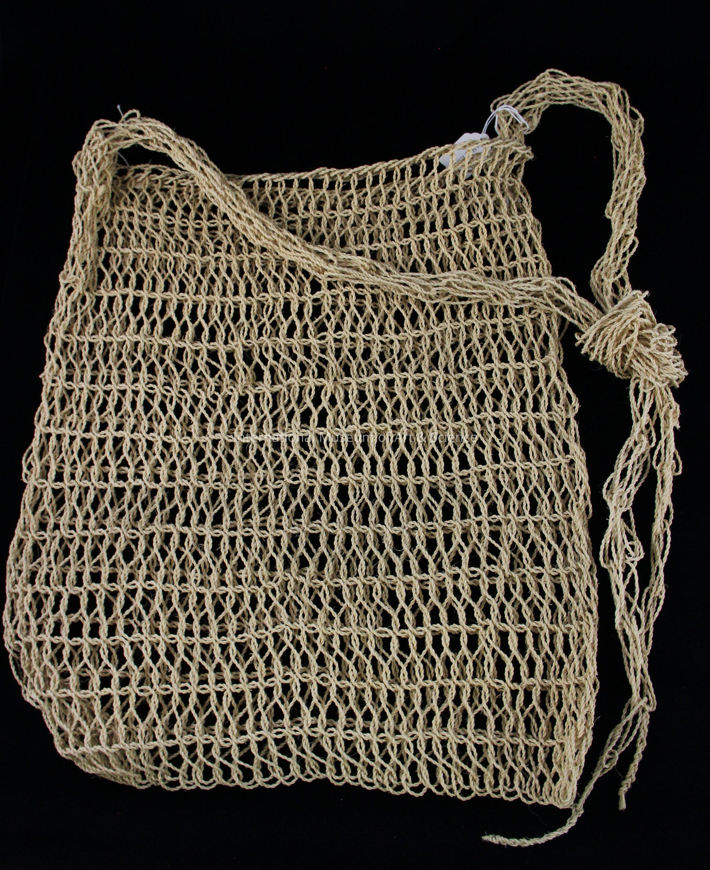 A woman's woven ixtle bag with large double straps. It has a square body, a mesh-like weave with open spaces, and a rough rope texture.