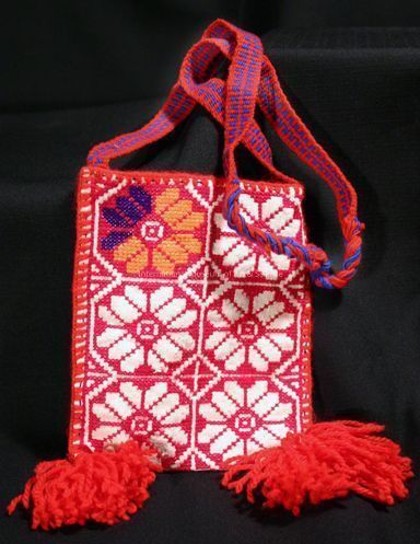 Handle is red and blue yarn; 6 flowers on front and back; one flower on side has orange & purple yarn petals all others are outlined in fuschia; 2 red tassles made of yarn at bottom of bag.