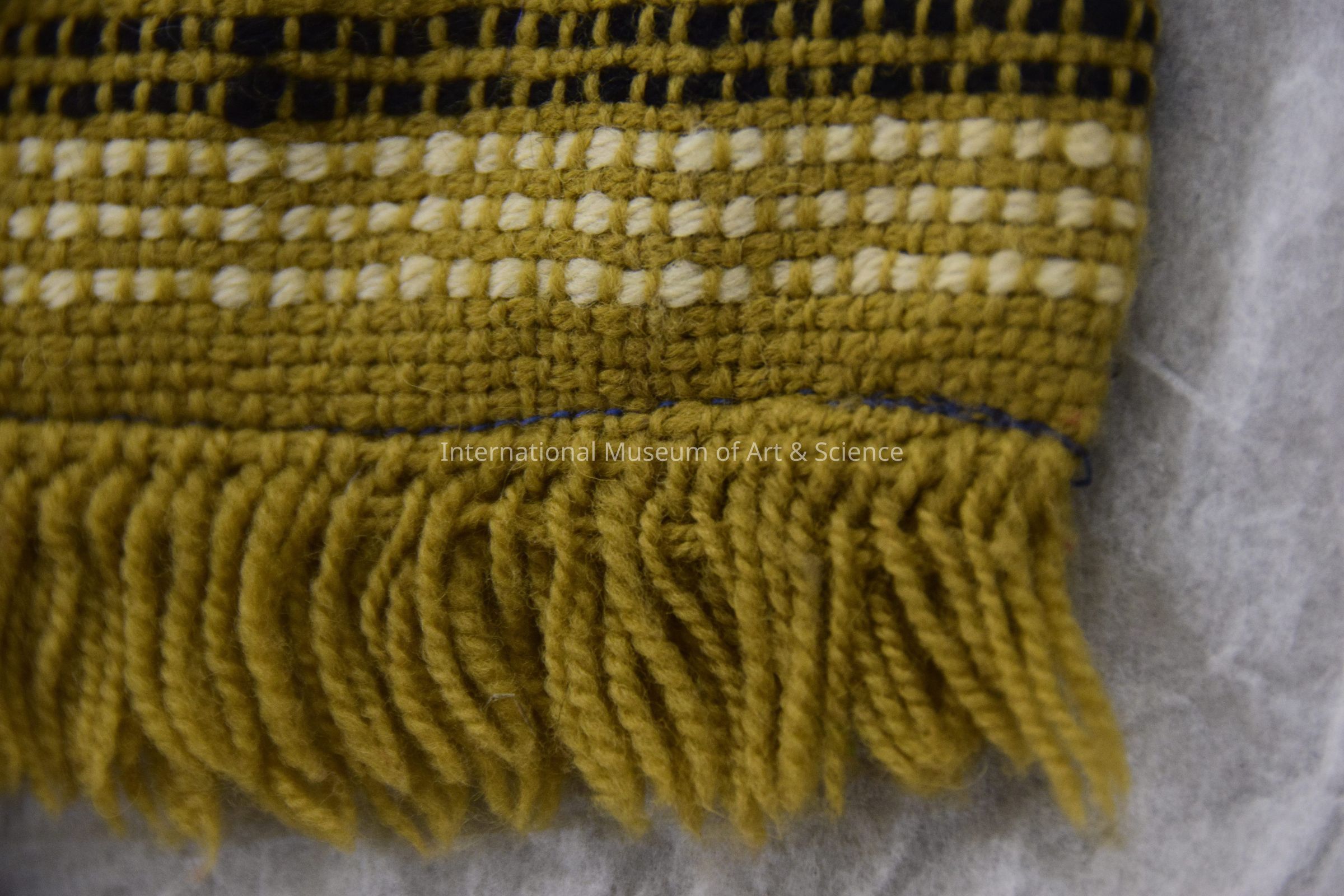 Rectangular hand-woven drawstring bag. The body of the bag is a camel colored plain weave with white and black yarn supplementary wefts, lined with a medium weight beige cotton cloth. White and black stripes circle the bag's top and bottom. A large, black, bold geometric flower and diamond design wraps around the mid-section, with two white arrow stripes on its top and bottom. "MACHUPICCHU" is written on the front side of the bag (interrupting the arrow stripe). A twisted multicolored yarn goes in and out along the top edge, and functions as the drawstring. The bag is soft to the touch and has fringes on the bottom.Dimensions