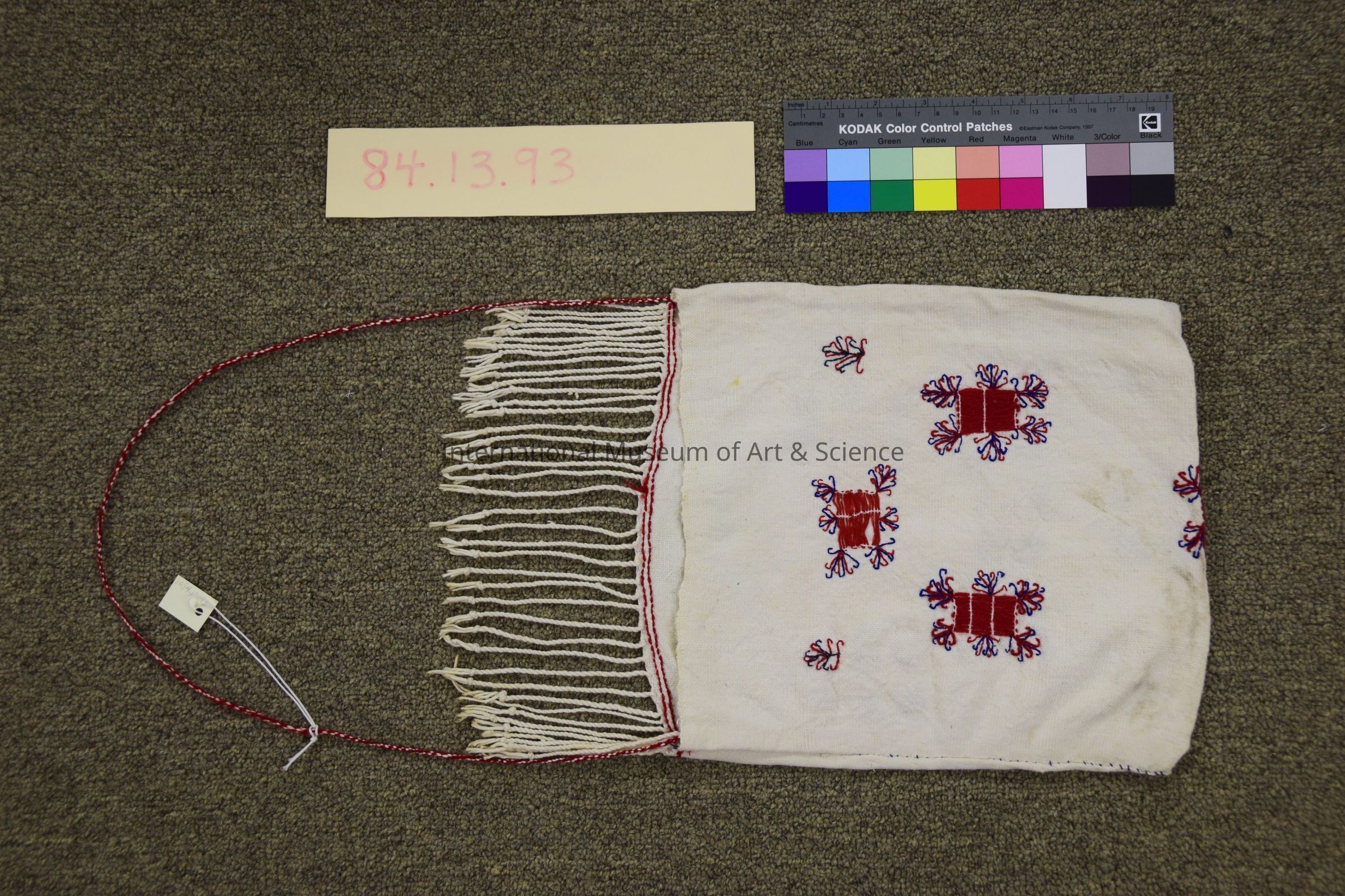Tzotzil bag. White muslin bag with embroidered motifs in red and a very thin shoulder strap. The motif embroideries are mostly done in red, but also have green and blue threads. The biggest, most repeated motif is a rectangle with corn stalk-like designs coming out from its four corners and two longer sides. It also has individual corn stalk-like designs on one side and sporadic cross marks on the other. The motifs are pretty spread out over the bag’s body and create a lot of white space. The bag has a thin, twisted yarn strap in red and white. One side of the top opening has knotted twisted fringes. This fringed side can be folded over to form a sort of flap. Bag is made from one piece of fabric folded in half and roughly hand sewn along the sides.Artwork Details