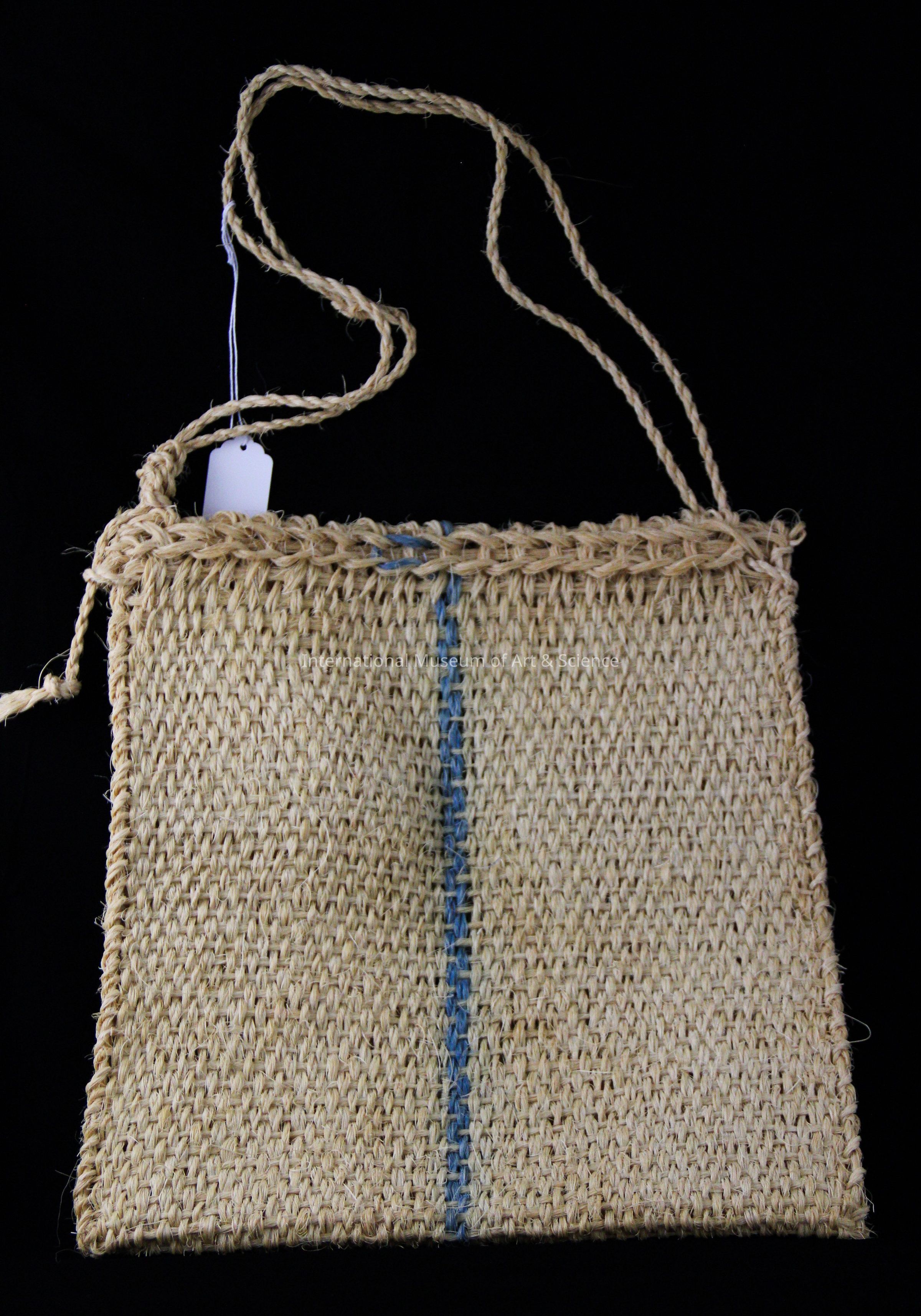 A rectangular shaped bag with a blue vertical band in center on the front and back. It has two twisted strands as handles.