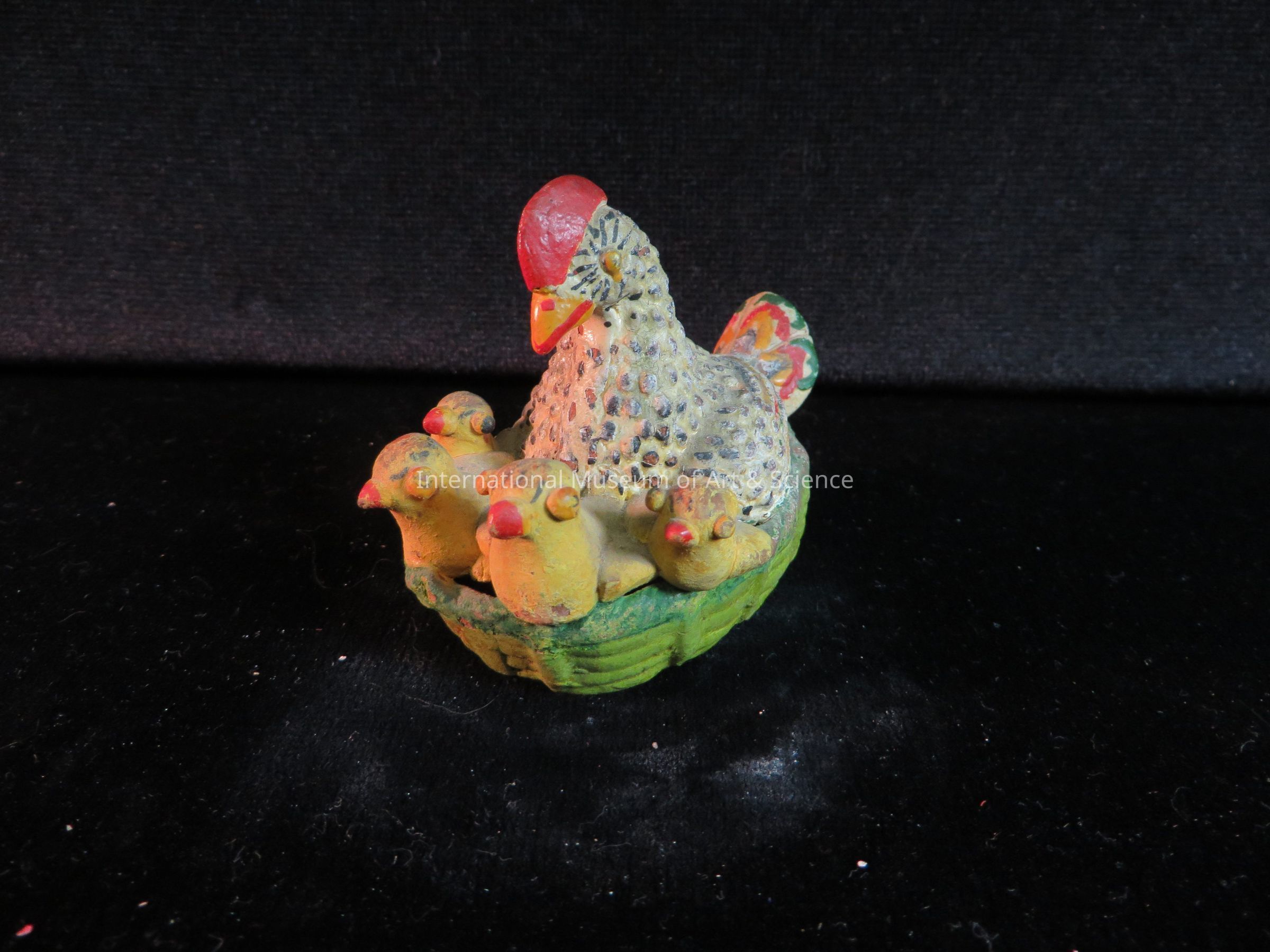 A miniature clay coin bank in form of hen and chicks in basket nest. The hen has a white body with black spots and yellow, red, and green accents on tail. The chicks are painted yellow with red beaks. The coin slot is on the hen's back.Dimensions
