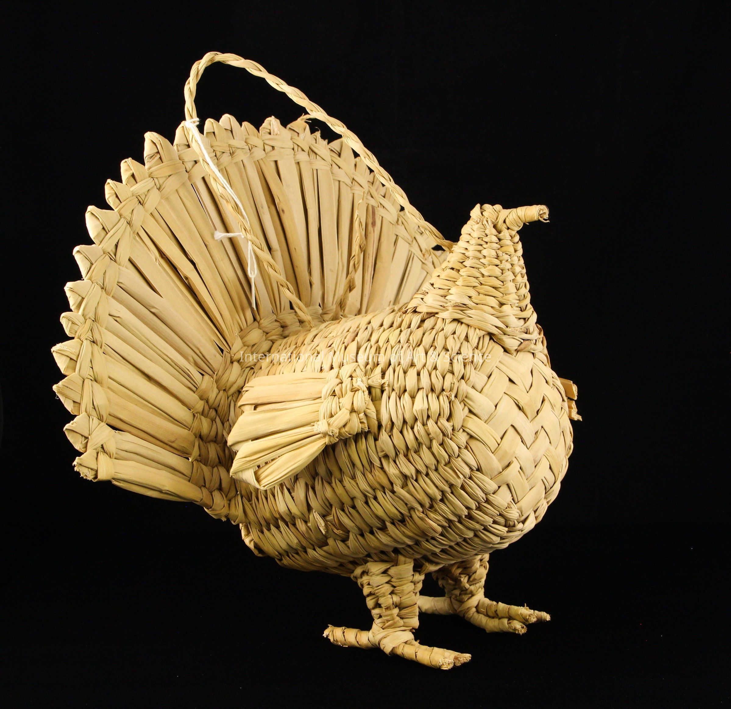A "piggy" bank, woven from palm leaves. The bank is in the shape of a turkey. The natural green palm leaves have been folded, woven, and gathered to form a turkey with two feet, spherical body, wings and projected feathers spread; square open slit for dropping money.Dimensions