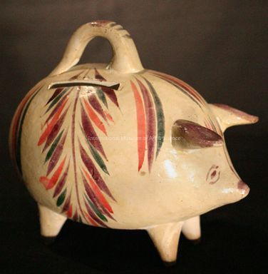 A cermaic piggy-bank. The bank has a cream colored body with maroon and green linear designs painted on top. There is a handle on top with a money slot on the top right side. The whole piece is coated in a varnish.Dimensions